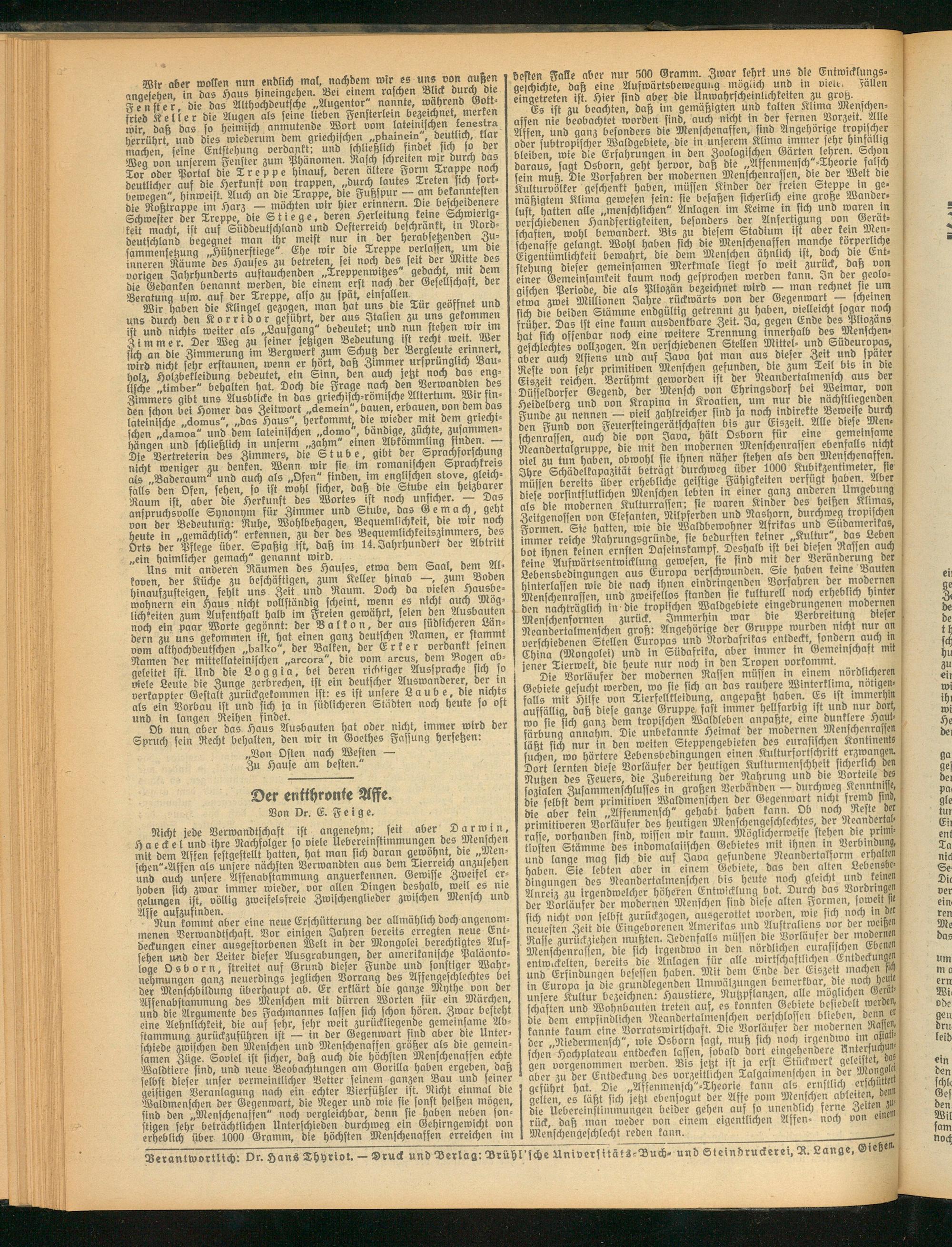 Nicht jede Verwandtschaft ist angenehm: fett aber Dar w t n, Haeckel und ihre Nachfolger so viele Uebereinstimmungen des Menschen mit dem Affen sestgestellt hatten, hat man sich daran gewohnt dte „Men- chen"-Assen als unsere nächsten Verwandten aus dem Tierreich anzusehen und auch unsere Afsenabstammung anzuerkennen. Gewisse Zweifel erhoben sich zwar immer wieder, vor allen Dingen deshalb, weil es nie gelungen ist, völlig zweifelsfreie Zwischenglieder zwischen Mensch und Affe aufzufinden. ,