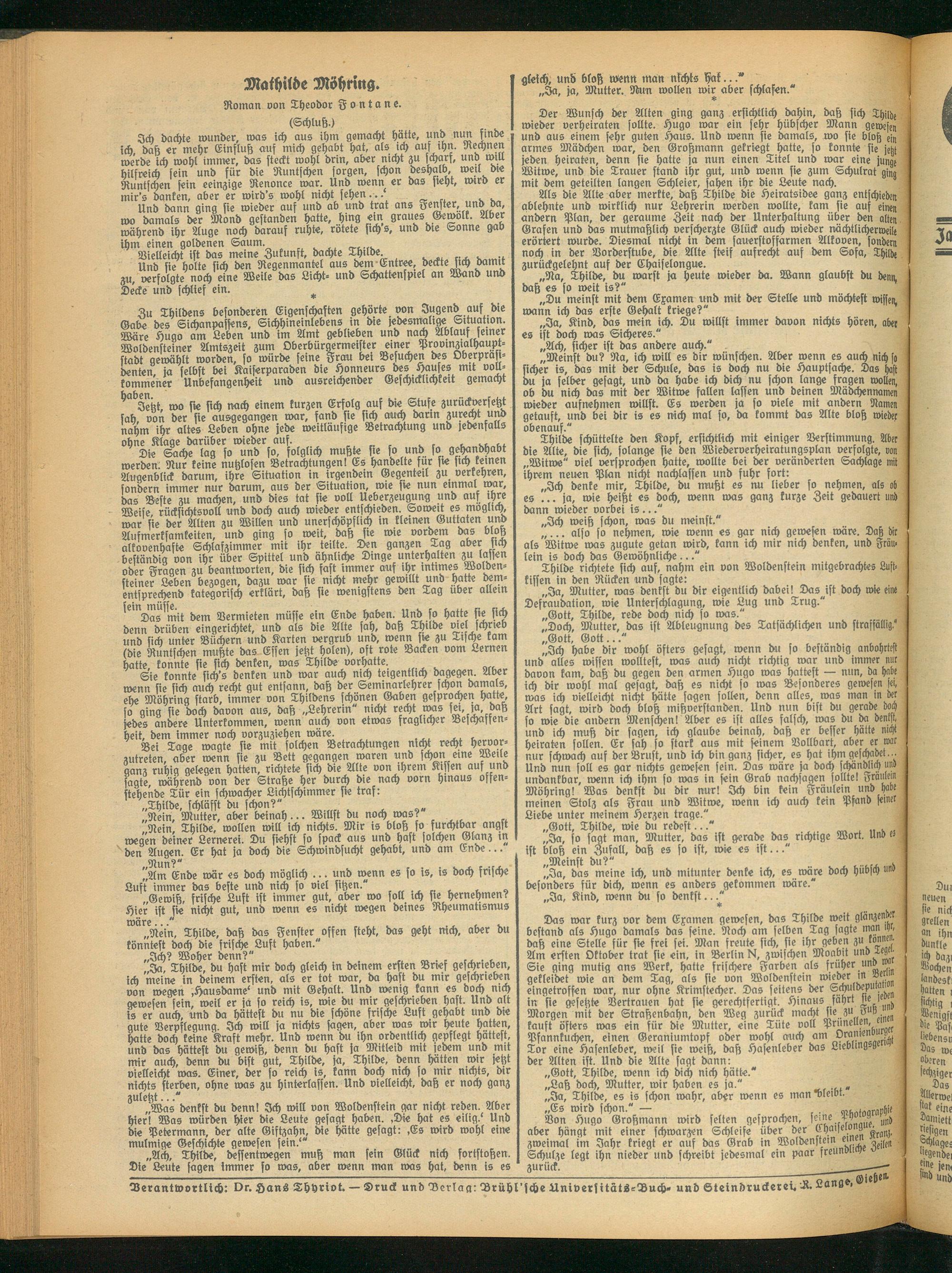 Thilde schüttelte den Kopf, ersichtlich mit einiger Verstimmung. Aber die Alte, die sich, solange sie den Wiederverheiratungsplan verfolgte, von „Witwe" viel versprochen hatte, wollte bei der veränderten Sachlage mit ihrem neuen Plan nicht nachlassen und fuhr fort: