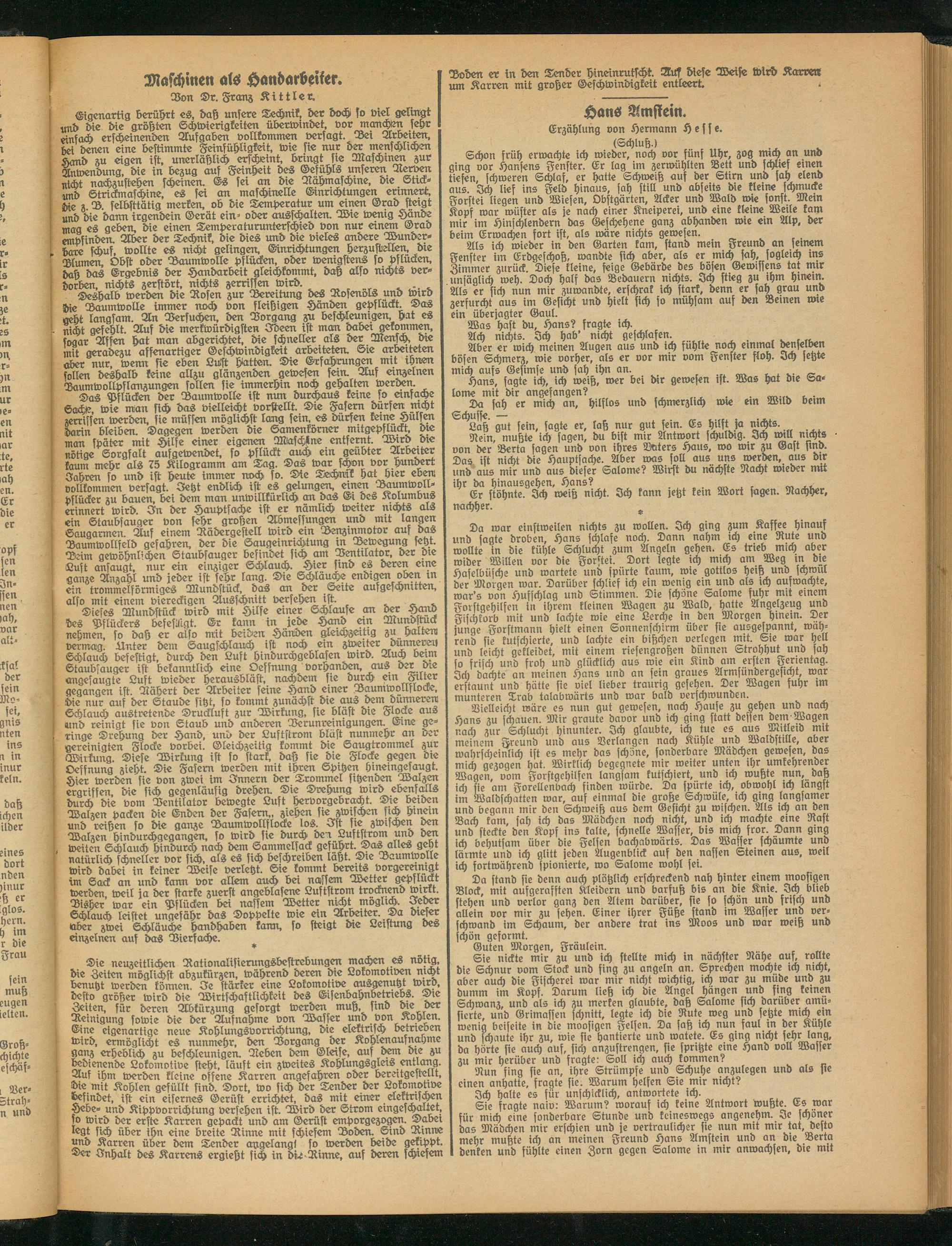 Da war einstweilen nichts zu wollen. Ich ging zum Kaffee hinauf und sagte droben, Hans schlafe noch. Dann nahm ich eine Stute und wollte in die kühle Schlucht zum Angeln gehen. Es trieb mich aber wider Willen vor die Forstei. Dort legte ich mich am Weg in die Haselbüsche und wartete und spürte kaum, wie gottlos heiß und schwul der Morgen war. Darüber schlief ich ein wenig ein und als ich aufwachte, war's von Hufschlag und Stimmen. Die schone Salome fuhr mit einem Forstgehilfen in ihrem kleinen Wagen zu Wald, hatte Angelzeug und Fischkorb mit und lachte wie eine Lerche in den Morgen hinein. Der junge Forstmann hielt einen Sonnenschirm über sie ausgespannt, während sie kutschierte, und lachte ein bißchen verlegen mit. Sie war hell und leicht gekleidet, mit einem riesengroßen dünnen Strohhut und sah so frisch und froh und glücklich aus wie ein Kind am ersten Ferientag. Ich dachte an meinen Hans und an fein graues Armsündergesicht, war erstaunt und hätte sie viel lieber traurig gesehen. Der Wagen fuhr im munteren Trab talabwärts und war bald verschwunden.