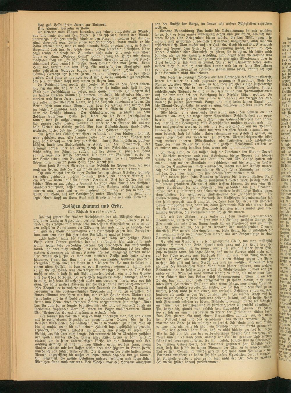 Ich traf gestern Dr. Robert Kleinschmidt, der als Mitglied einer englisch-amerikanischen Expedition versucht hatte, den Mount Everest zu besteigen. Er erzählte mir einige sehr interessante Einzelheiten; er wies auf den religiösen Fanatismus der Tibetaner hin und sagte, es herrsche dort am Fuß des Gaurisankarmassivs eine Feindschaft gegen das Europäer- tum, von dem man sich hier keine Vorstellung machen könne.