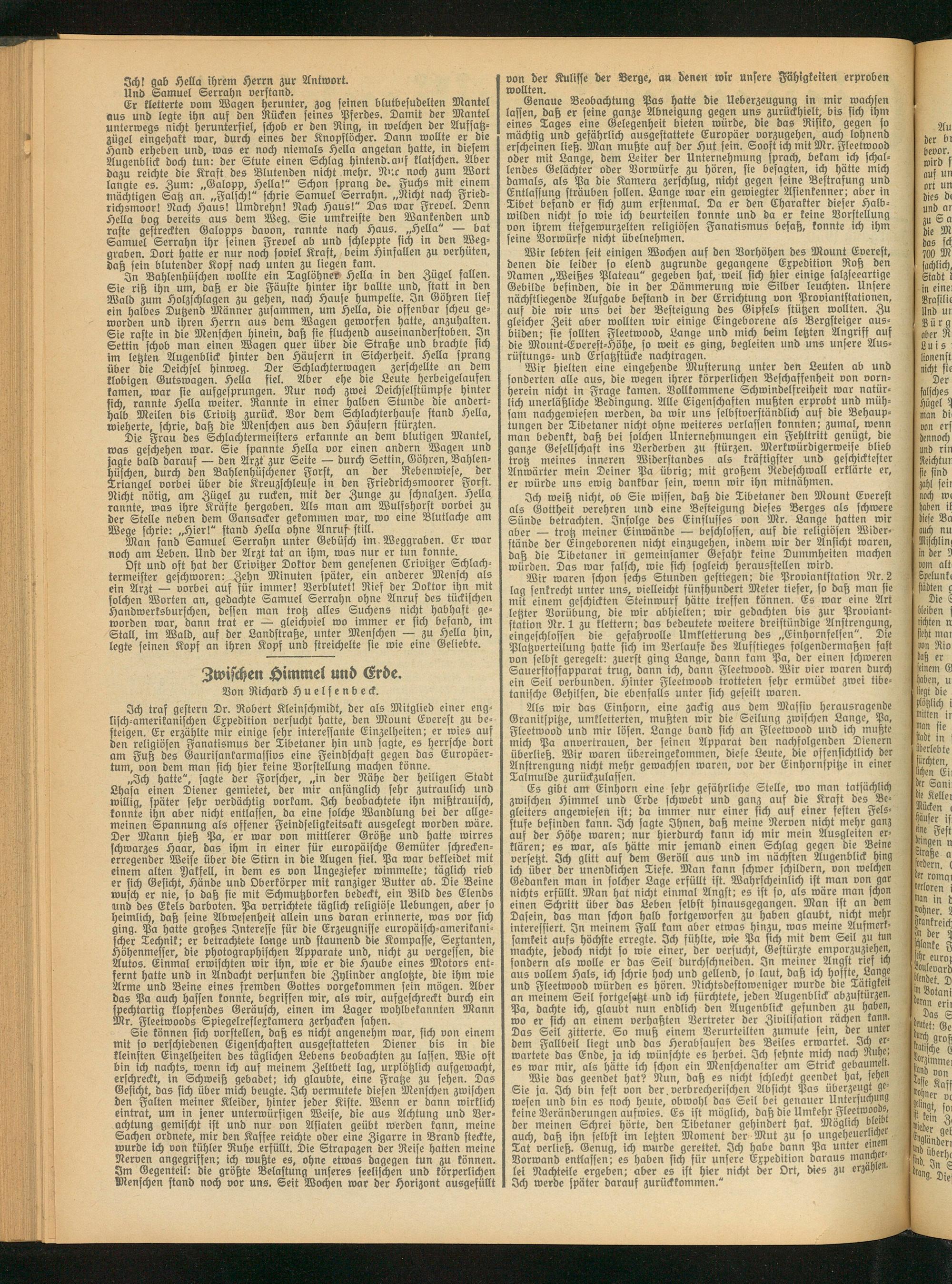 Wie das geendet hat? Nun, daß es nicht schlecht geendet hat, sehen Sie ja. Ich bin fest von der. verbrecherischen Absicht Pas überzeugt gewesen und bin es noch heute, obwohl das Seil bei genauer Untersuchung keine Veränderungen aufwies. Es ist möglich, daß die Umkehr Fleetwoods, der meinen Schrei hörte, den Tibetaner gehindert hat. Möglich btew auch, daß ihn selbst im letzten Moment der Mut zu so ungeheuerliche Tat verließ. Genug, ich wurde gerettet. Ich habe bann Pa unter eine Vorwand entlassen; es haben sich für unsere Expedition daraus manche - lei Nachteile ergeben; aber es ist hier nicht der Ort, dies zu erzähl Ich werde später darauf zurückkommen."