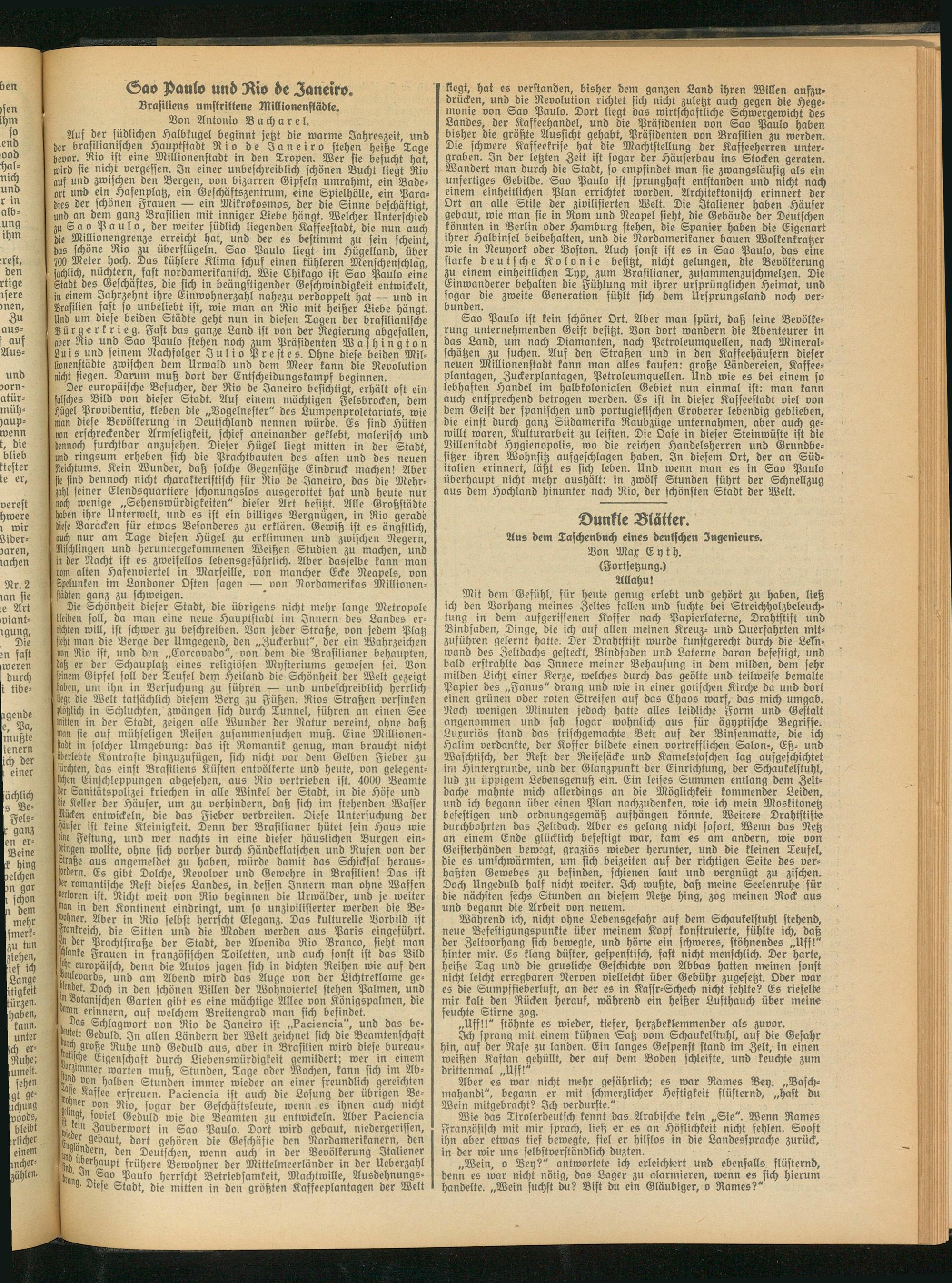 Sao Paulo ist kein schöner Ort. Aber man spürt, daß seine Bevölkerung unternehmenden Geist besitzt. Von dort wandern die Abenteurer in das Land, um nach Diamanten, nach Petroleumguellen, nach Mineralschätzen zu suchen. Auf den Straßen und in den Kaffeehäusern dieser neuen Millionenstadt kann man alles kaufen: große Ländereien, Kaffeeplantagen, Zuckerplantagen, Petroleumguellen. Und wie es bei einem so lebhaften Handel im halbkolonialen Gebiet nun einmal ist: man kann auch entsprechend betrogen werden. Es ist in dieser Kaffeestadt viel von dem Geist der spanischen und portugiesischen Eroberer lebendig geblieben, die einst durch ganz Südamerika Raubzüge unternahmen, aber auch gewillt waren, Kulturarbeit zu leisten. Die Oase in dieser Steinwüste ist die Villenstadt Hygienopolis, wo die reichen Handelsherren und Grundbesitzer ihren Wohnsitz ausgeschlagen haben. In diesem Ort, der an Süditalien erinnert, läßt es sich leben. Und wenn man es in Sao Paulo überhaupt nicht mehr aushält: in zwölf Stunden führt der Schnellzug aus dem Hochland hinunter nach Rio, der schönsten Stadt der Wett.