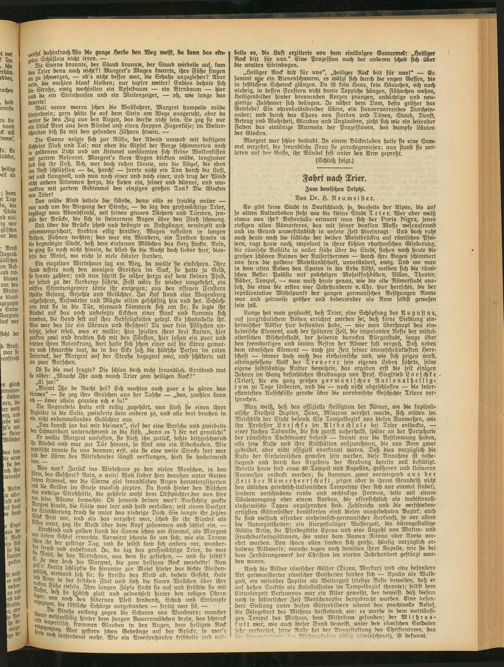 Das müde Kind faltete die Hände, dann eilte es freudig weiter — nun noch um die Biegung der Straße, — da lag das großmächtige Trier, beglänzt vom Abendstrahl, mit seinen grauen Dächern und Türmen, jenseits der Brücke, die sich in steinernem Bogen über den Fluß schwang.