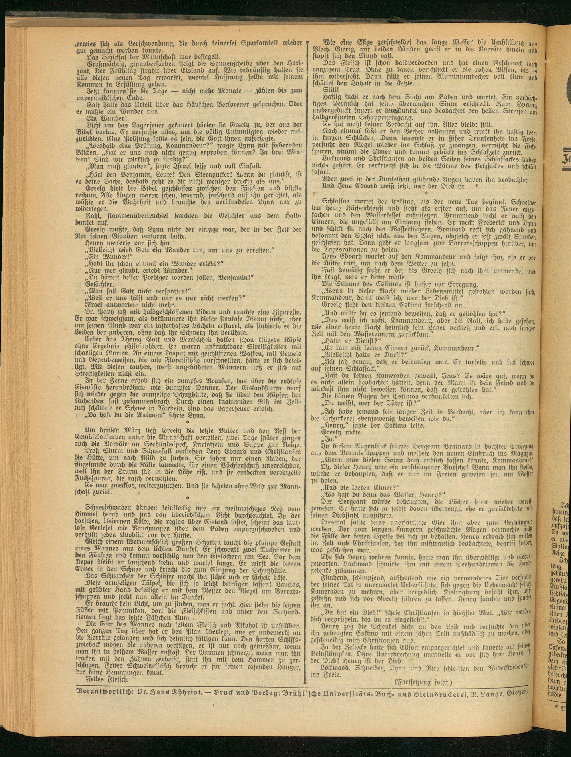 Schlaflos wartet der Eskimo, bis der neue Tag beginnt. Schneider hat heute Küchendienst und steht als erster auf, um das Feuer anzu- fachen und den Wafferkesfel aufzusetzen. Brummend sucht er nach den Eimern, die ungefüllt am Eingang stehen. Er weckt Frederick und Lynn und schickt sie nach den Wasserlöchern. Brainard reckt sich gähnend und bekommt den Schlaf nicht aus den Augen, obgleich er fast zwölf Stunden geschlafen hat. Dann geht er langsam zum Vorratsschuppen hinüber, um die Tagesrationen zu holen.