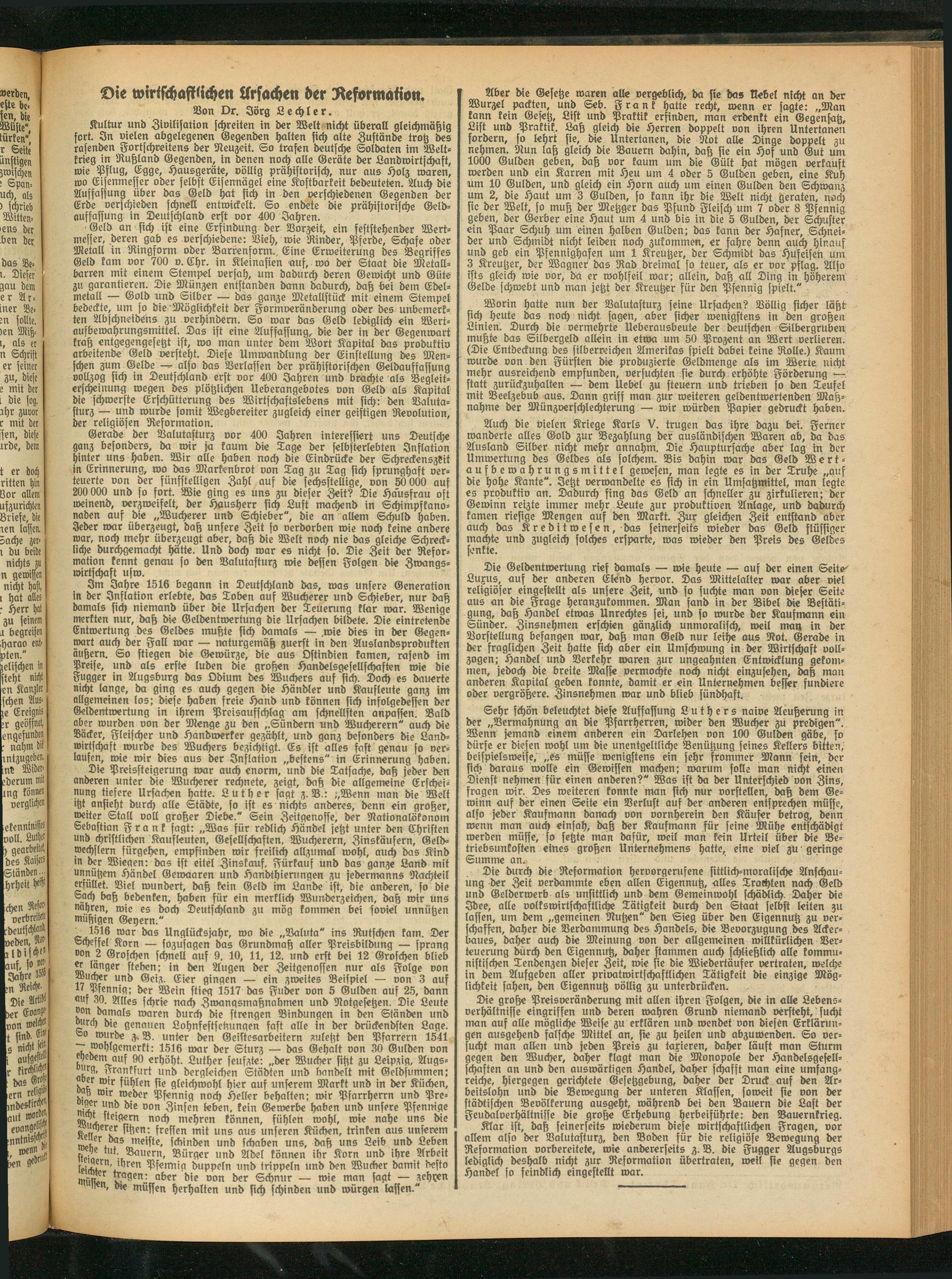 Klar ist, daß seinerseits wiederum diese wirtschaftlichen Fragen, vor allem also ber Valutasturz, ben Boben für bie religiöse Bewegung der Reformation vorbereitete, wie andererseits z. B. die Fugger Augsburgs lediglich deshalb nicht zur Reformation übertraten, weil sie gegen den Handel so feindlich eingestellt war.
