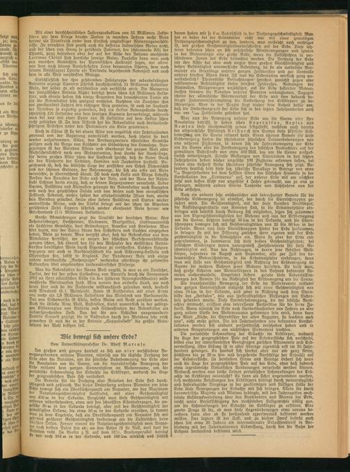 Im großen und ganzen handelt es sich um vier verschiedene Bewegungsformen unseres Planeten, nämlich um die tägliche Drehung der Erde oder die Rotation, um die jährliche Bahnbewegung der Erde ober die Revolution um die Sonne, um die translatorische Bewegung der Erde mitsamt dem ganzen Sonnensystem im Weltenraume, um die periodische Schwankung der Erdachse im Erdkörper, wodurch die Lage der geographischen Pole sich verändert.