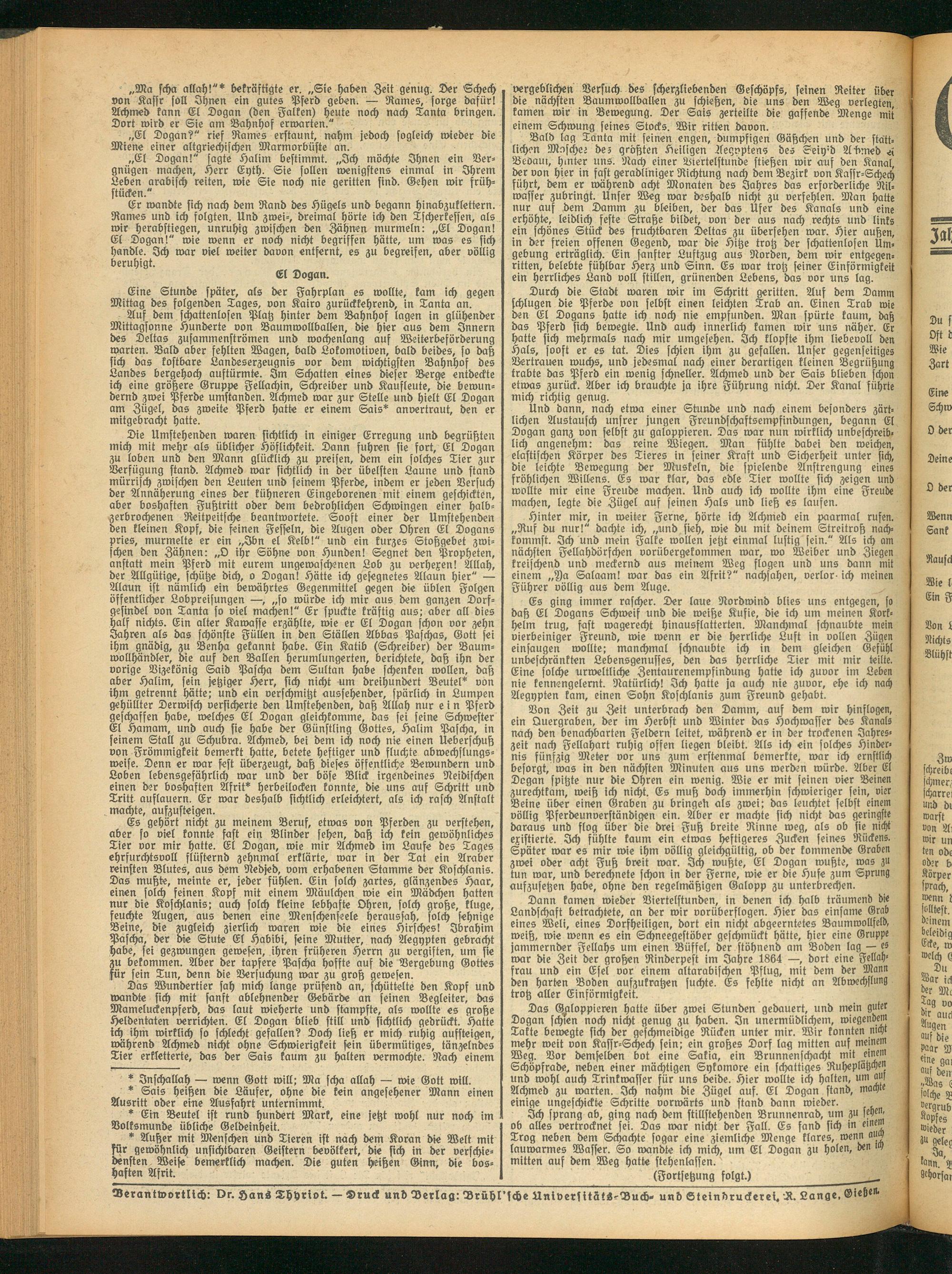 Er wandte sich nach dem Rand des Hügels und begann hinabzuklettern. Rames und ich folgten. Und zwei-, dreimal hörte ich den Tscherkeffen, als wir herabstiegen, unruhig zwischen den Zähnen murmeln: „El Dogan! El Dogan!" wie wenn er noch nicht begriffen hätte, um was es sich handle. Ich war viel weiter davon entfernt, es zu begreifen, aber völlig beruhigt.