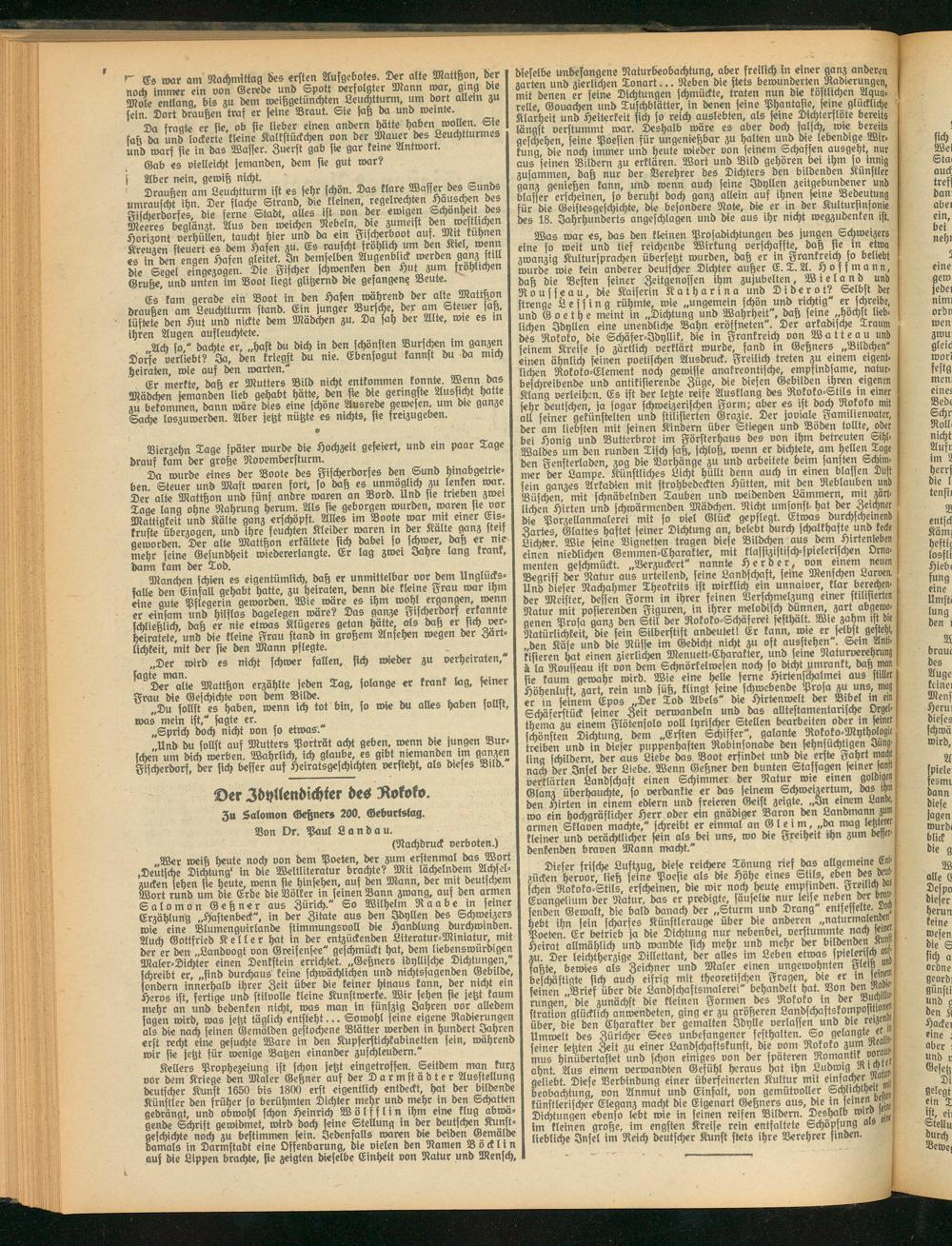 dieselbe unbefangene Naturbeobachtung, aber freilich in einer ganz anderen zarten und zierlichen Tonart... Neben die stets bewunderten Radierungen, mit denen er seine Dichtungen schmückte, traten nun die köstlichen Aquarelle, Gouachen und Tuschblätter, in denen seine Phantasie, sein« glückliche Klarheit und Heiterkeit sich so reich auslebten, als seine Dichterslöte bereits längst verstummt war. Deshalb wäre es aber doch falsch, wie bereits geschehen, seine Poesien für ungenießbar zu halten und die lebendige Wirkung, die noch immer und heute wieder von seinem Schaffen ausgeht, nur aus seinen Bildern zu erklären. Wort und Bild gehören bei ihm so innig zusammen, daß nur der Berehrer des Dichters den bildenden Künstler oanz genießen kann, und wenn auch seine Idyllen zeitgebundener und bla jer erscheinen, so beruht doch ganz allein auf ihnen seine Bedeutung für die Geistesgeschichte, die besondere Note, die er in der Kultursinfonie des 18. Jahrhunderts angeschlagen und die aus ihr nicht wegzudenken ist.