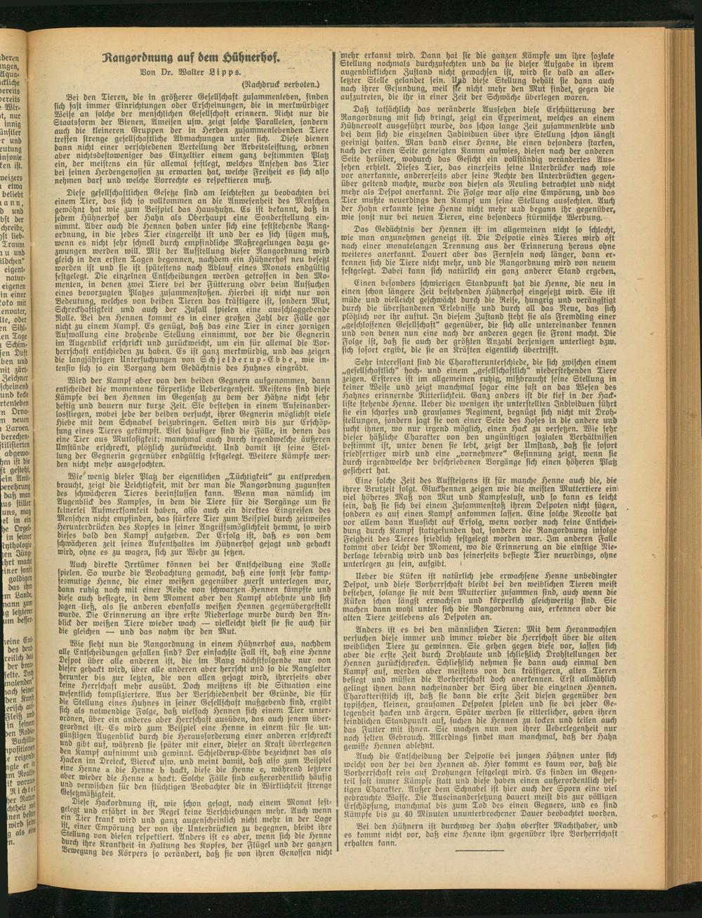 Bei den Tieren, die in größerer Gesellschaft Zusammenleben, finden sich fast immer Einrichtungen oder Erscheinungen, die in merkwürdiger Weise an solche der menschlichen Gesellschaft erinnern. Nicht nur die Staatsform der Bienen, Ameisen usw. zeigt solche Parallelen, sondern auch die kleineren Gruppen der in Herden zusammenlebenden Tiere treffen strenge gesellschaftliche Abmachungen unter sich. Diese dienen dann nicht einer verschiedenen Verteilung der Arbeitsleistung, ordnen aber nichtsdestoweniger das Einzeltier einem ganz bestimmten Platz ein, der meistens ein für allemal festlegt, welches Ansehen das Tier bei seinen Herdengenossen zu erwarten hat, welche Freiheit es sich also nehmen darf und welche Vorrechte es respektieren muß.