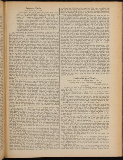Karl Schefsler, der vor 20 Jahren mit seinem Buch „Berlin, ein S t a d t s ch i ck s a l" so viel Aussehen erregte, hat ein neues Buch über Berlin geschrieben, das soeben bei Bruno C a s s i r e r in Berlin erscheint: Berlin, Wandlungen einer Stadt (Preis --eb. 12 Mark, mit 80 Abbildungen — 490). Nach tiesfchürfenden Betrachtungen über die historische Stadt zeichnet er hier das neue Berlin, das „in den verslossenen beiden Jahrzehnten zwar älter, aber auch srischer, starker und selbstbewusster, zwar materiell armer, aber reicher im Willen, zugleich weltstädtischer und der Gesinnung nach deutscher geworden ist". Wir geben als beste Empsehlung für das aufschlußreiche und anregende Buch hier eine» Teil des Schlußabschnittes wieder.