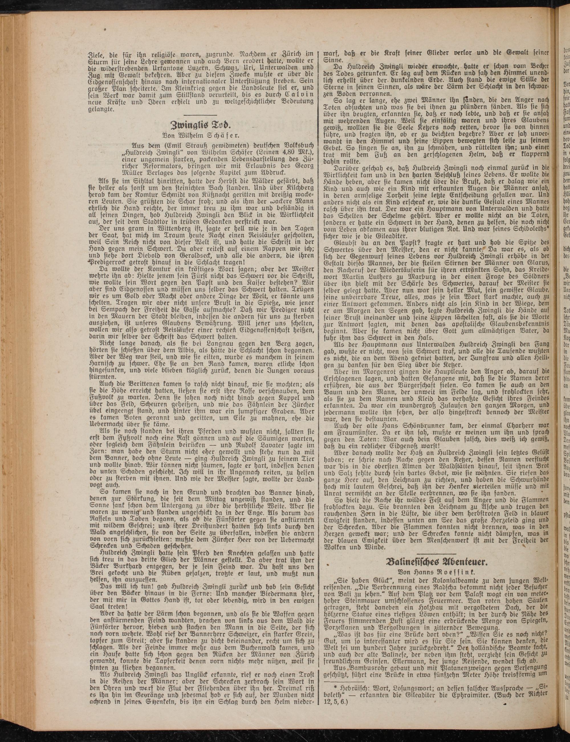 Aus dem (Emil Strauß gewidmeten) deutschen Volksbuch „Huldreich Zwingli" von Wilhelm Schäfer (Leinen 4,80 Mk.), einer ungemein starken, packenden Lebensdarstellung des Züricher Reformators, bringen wir mit Erlaubnis des Georg Müller Berlages das folgende Kapitel zum Abdruck.