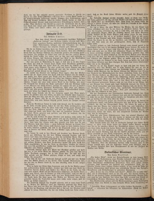 Als Huldreich Zwingli das Unglück erkannte, rief er noch einen Trost in die Reihen der Männer; aber der Schrecken zerbrach sein Wort in den Ohren und wcrf die Flut der Fliehenden über ihn her. Dreimal riß es ihn hin im Georänge und jedesmal hob er sich auf, der Wunden nicht achrend in seinen S henkeln, bis ihn ein Schlag durch den Helm nieder