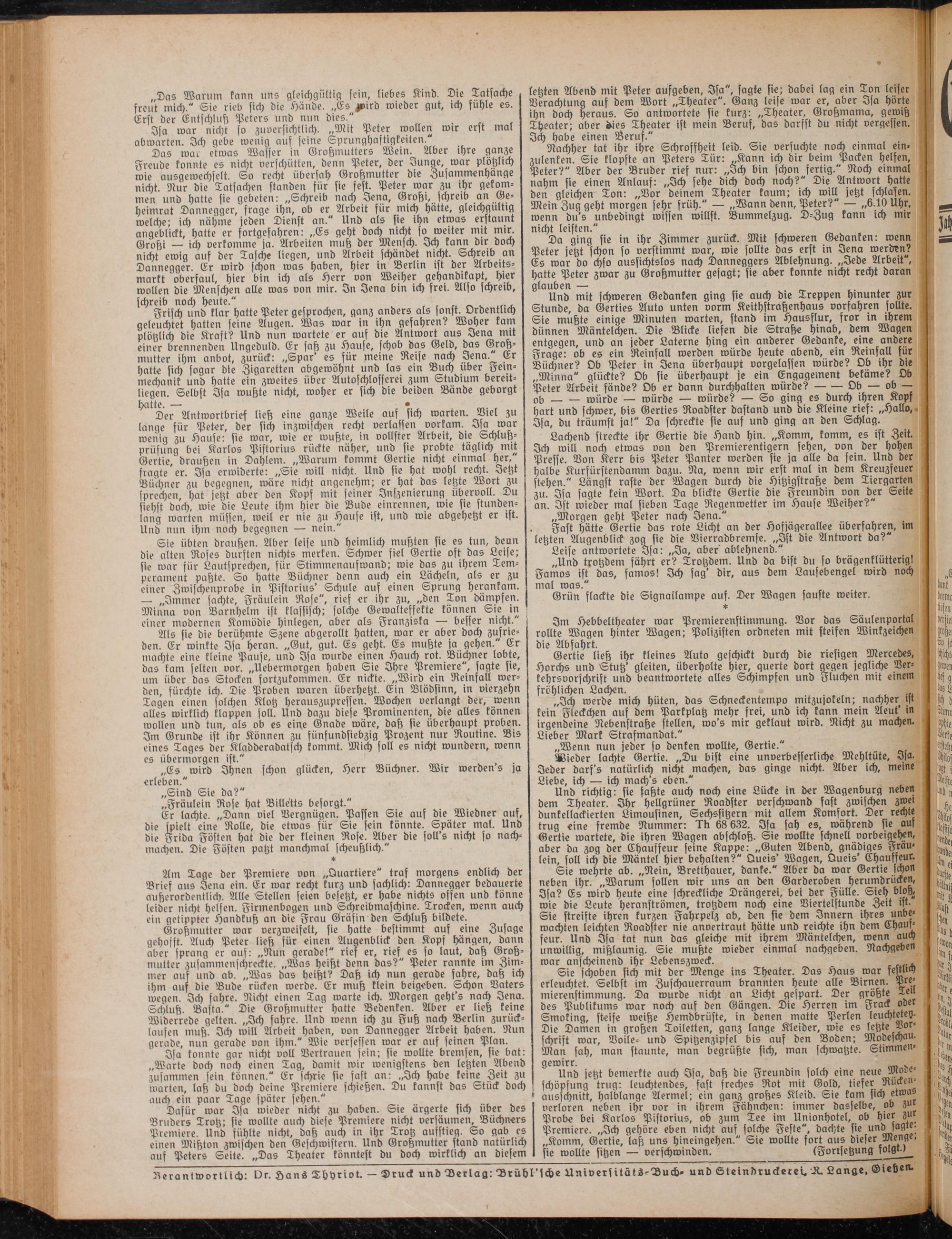 Dafür war Isa wieder nicht zu haben. Sie ärgerte sich über des Bruders Trotz; sie wollte auch diese Premiere nicht versäumen, Büchners Premiere. Und fühlte nicht, daß auch in ihr Trotz aufftieg. So gab cs einen Mißton zwischen den Geschwistern. Und Großmutter stand natürlich auf Peters Seite. „Das Theater könntest du doch wirklich an diesem