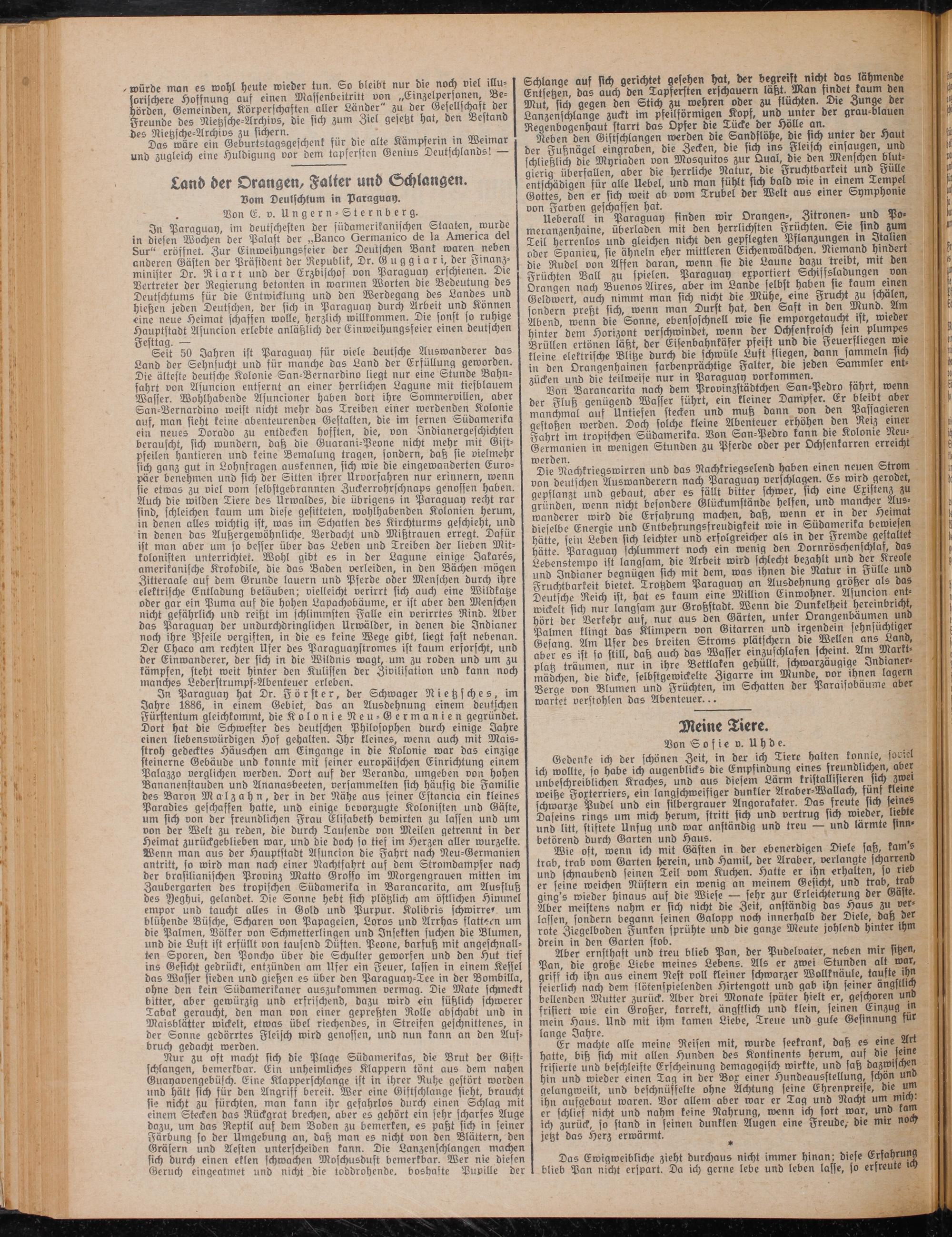 In Paraguay hat Dr. F ö r ft e r, der Schwager Nietzsches, im Jahre 1886, in einem Gebiet, das an Ausdehnung einem deittichen Fürstentum gleichkommt, dieKolonieNeu-Germanien gegründet. Dort hat die Schwester des deutschen Philosophen durch einige Jahre einen liebenswürdigen Hof gehalten. Ihr kleines, wenn auch mit Maisstroh gedecktes Häuschen am Eingänge in die Kolonie war das einzige steinerne Gebäude und konnte mit seiner europäischen Einrichtung einem Palazzo verglichen werden. Dort auf der Veranda, umgeben von hohen Bananenstauden und Ananasbeeten, versammelten sich häusig die Familie des Baron Malzahn, der in der Nähe aus seiner Estancia ein kleines Paradies geschaffen hatte, und einige bevorzugte Kolonisten und Gäste, um sich von der freundlichen Frau Elisabeth bewirten zu lassen und um von der Wett zu reden, die durch Tausende von Meilen getrennt in der Heimat zurückgeblieben war, und die doch so tief im Herzen aller wurzelte. Wenn man aus der Hauptstadt Asuncion die Fahrt nach Neu-Germanien antritt, so wird man nach einer Nachtfahrt auf dem Stromdampser nach der brasilianischen Provinz Motto Grosso im Morgengrauen mitten im Zaubergarten des tropischen Südamerika in Barancarita, am Ausfluß des Peghui, gelandet. Die Sonne hebt sich plötzlich am östlichen Himmel empor und taucht alles in Gold und Purpur. Kolibris schwirre» um blühende Büsche, Scharen von Papageien, Coros und Arrhas flattern um die Palmen, Volker von Schmetterlingen und Insekten suchen die Blumen, und die Lust ist erfüllt von tausend Duften. Peone, barfuß mit angeschnallten Sporen, den Poncho über die Schulter geworfen und den Huk tief ins Gesicht gedrückt, entzünden am Ufer ein Feuer, lassen in einem Kessel das Wasser sieden und gießen es über den Paraguay-Tee in der Bomdilla, ohne den kein Südamerikaner auszukommen vermag. Die Mate schmeckt bitter, aber gewürzig und erfrischend, dazu wird ein süßlich schwerer Tabak geraucht, den' man von einer gepreßten Rolle abschabt und in Maisblätter wickelt, etwas übel riechendes, in Streifen geschnittenes, in der Sonne gedorrtes Fleisch wird genossen, und nun kann an den Ausbruch gedacht werden.