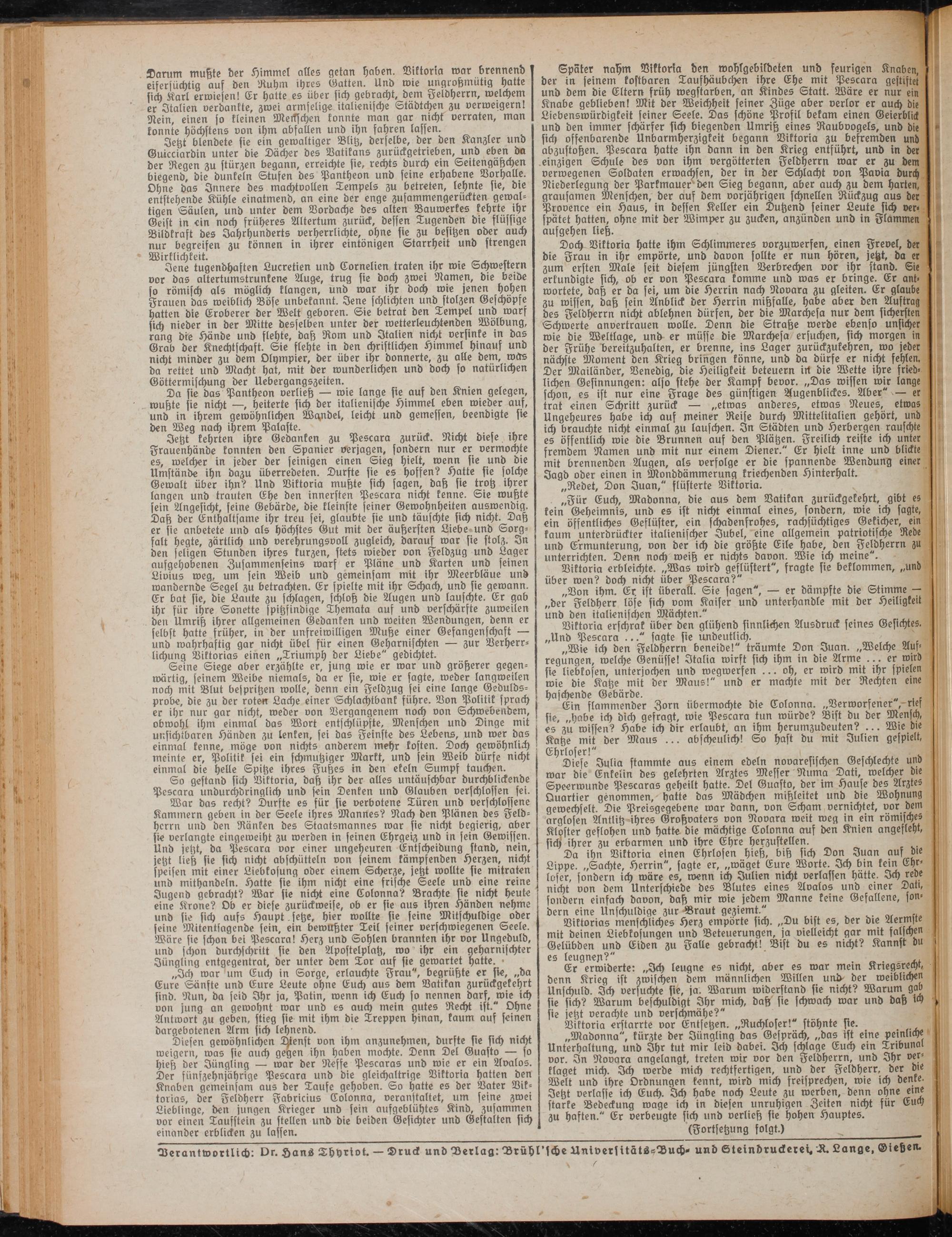 So gestand sich Viktoria, daß ihr der alles untäuschbar durchblickende Pescara undurchdringlich und sein Denken und Glauben verschlossen fei.