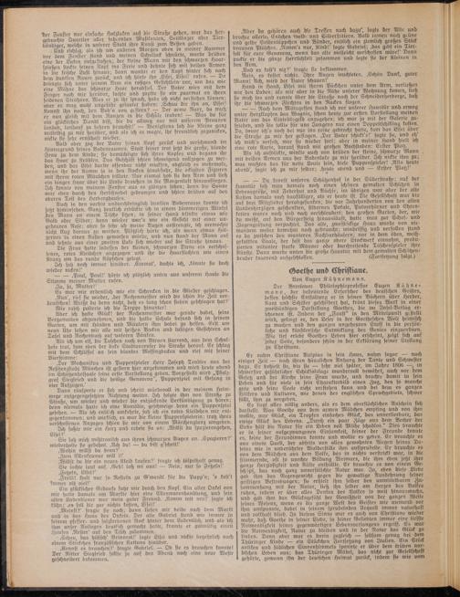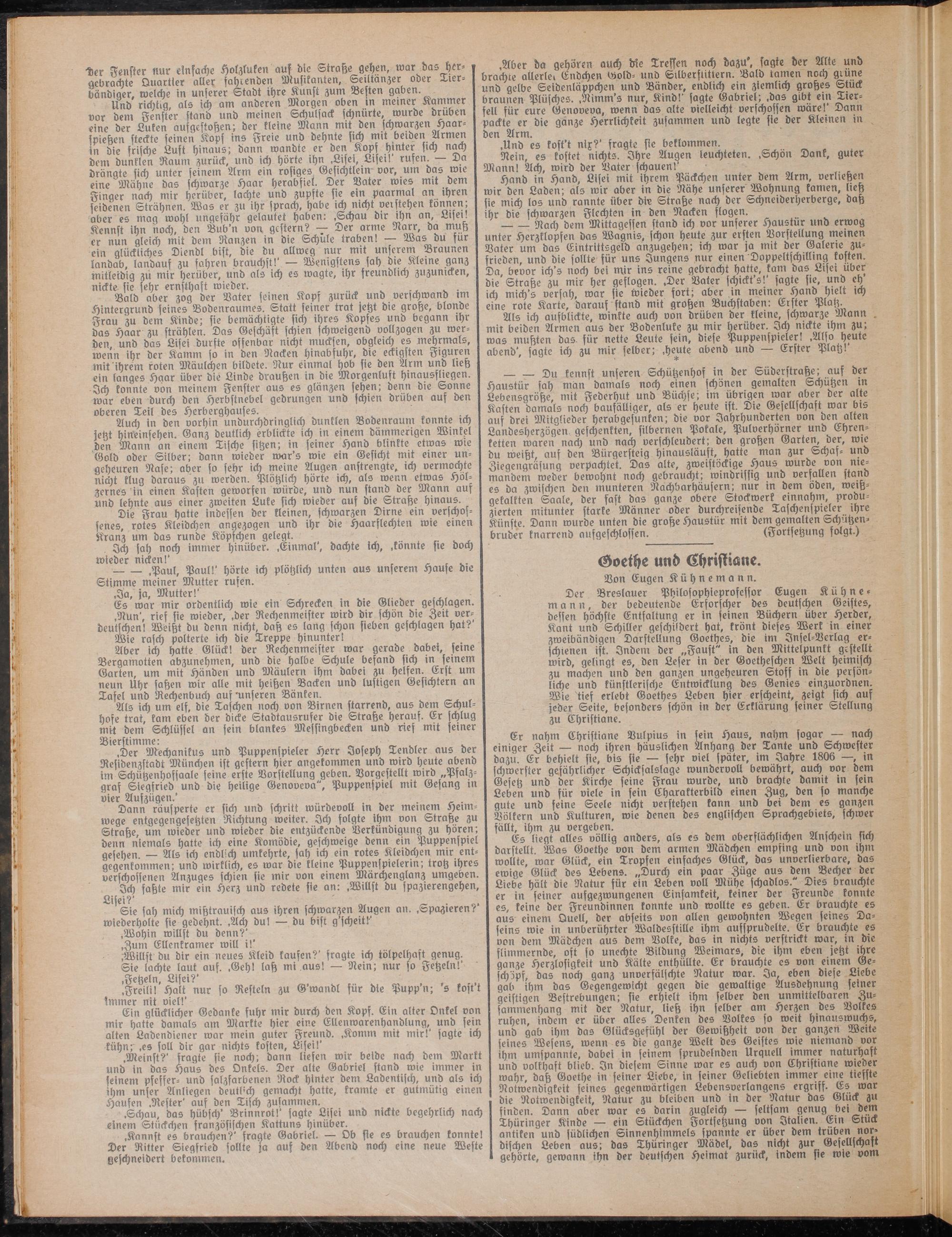 Der Breslauer Philosophieprofesfor Eugen Kühne- mann, der bedeutende Erforscher des deutschen Geistes, dessen höchste Entfaltung er in feinen Büchern über Herder, Kant und Schiller geschildert hat, krönt dieses Werk in einer zweibändigen Darstellung Goethes, die im Insel-Verlag erschienen ist. Indem der „Faust" in den Mittelpunkt gestellt wird, gelingt es, den Leser in der Goetheschen Welt heimisch zu machen und den ganzen ungeheuren Stoss in die persönliche und künstlerische Entwicklung des Genies einzuordne». Wie tief erlebt Goethes Leben hier erscheint, zeigt sich auf jeder Seite, besonders schön in der Erklärung seiner Stellung zu Christiane.