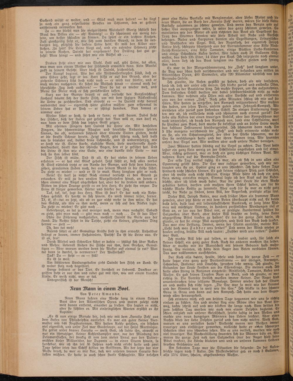 „Es ist nun einige Monate her, daß wir mit dem .Horatio Foß' aus dem Hasen von Philadelphia ausliefen. Es war ein guter kleiner Bier- master mit 846 Registertonnen. Wir hatten Kohle geladen, ein bißchen viel eigentlich, und unser Ziel war Guadeloupe, auf der Insel Martinique. Da geriet unser braver Horatio — weih Gott, ich liebte ihn, obwohl er nur ein schmutziger, kleiner Kohlendampfer war, vor der Mündung des Delawareflusses, der dreckig ist von dem vielen Unrat aus den Pulver- mühlen dieser Milliardäre, der Duponts — in einen Sturm hinein, so furchtbar, wie ich ihn seit 35 Jahren noch nicht erlebt hatte und zwei Tage später trieb das Schiss hilflos im Golfstrom. Als der letzte der vier Maste brach, da war es mir klar, daß wir unseren braven Horatio verlassen müßten. Er hatte ja auch schon starke Schlagseite. Wir besaßen