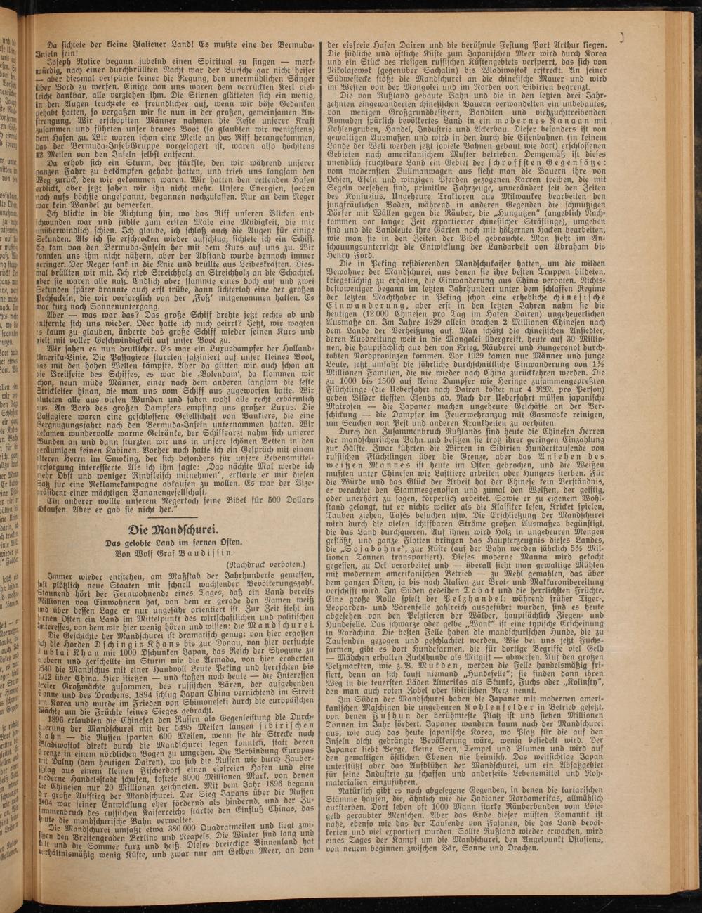 Immer wieder entstehen, am Maßstab der Jahrhunderte gemessen, list plötzlich neue Staaten mit schnell wachsender Bevölkerungszahl. Staunend hört der Fernwohnende eines Tages, daß ein Land bereits Millionen von Einwohnern hat, von dem er gerade den Namen weih iitb über besten Lage er nur ungefähr orientiert ist. Zur Zeit steht im hnen Osten ein Lanb im Mittelpunkt bes wirtschaftlichen und politischen viitereffes, von bem wir hier wenig hören unb wissen: bic Manbschu r e t.