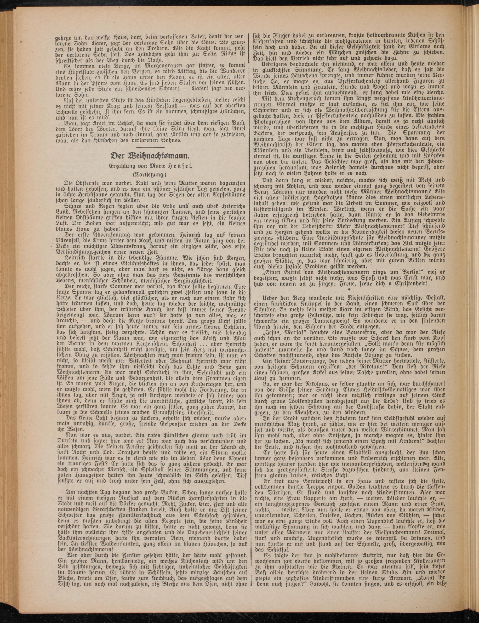 Nun war es aus, vorbei. Ein rotes Pünktchen glomm noch trüb im Dunkeln und sagte: hier war es! Nun war auch das verschwunden und alles schwarz. Die kleinen Fenster zeichneten sich matt an der Wand ab, sonst Nacht und Tod. Draußen heulte und tobte es, ein Sturm wollte kommen. Heinrich war es so elend wie nie im Leben. War denn Advent ein trauriges Fest? Er halte sich das so ganz anders gedacht. Er war doch ein schwacher Mensch, ein Spielball seiner Stimmungen, und seine guten Hausgeister hatten ihn heute schmählich im Stich gelassen. Tief seufzte er aus und kroch unter sein^Fell, ohne sich auszuzi'ehen.