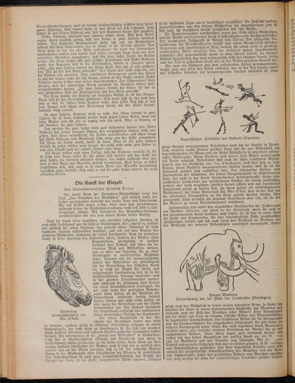 Der vierte Band der Propyläen-Weltgeschichte trügt den Titel „Das Erwachen der Menschheit" und enthüll unter den bisher vorliegenden vielleicht das meiste Neue und Unbekannte. Bis auf 20 000 Jahre v. Ehr. kann man jetzt zurückschauen, während bisher die Geschichtsbetrachtung meist erst 5000 v. Ehr. einzusetzen pflegte. Mit Erlaubnis des Propyläen-Berlages veröffentlichen wir aus dem neuen Bande diesen Aufsatz: