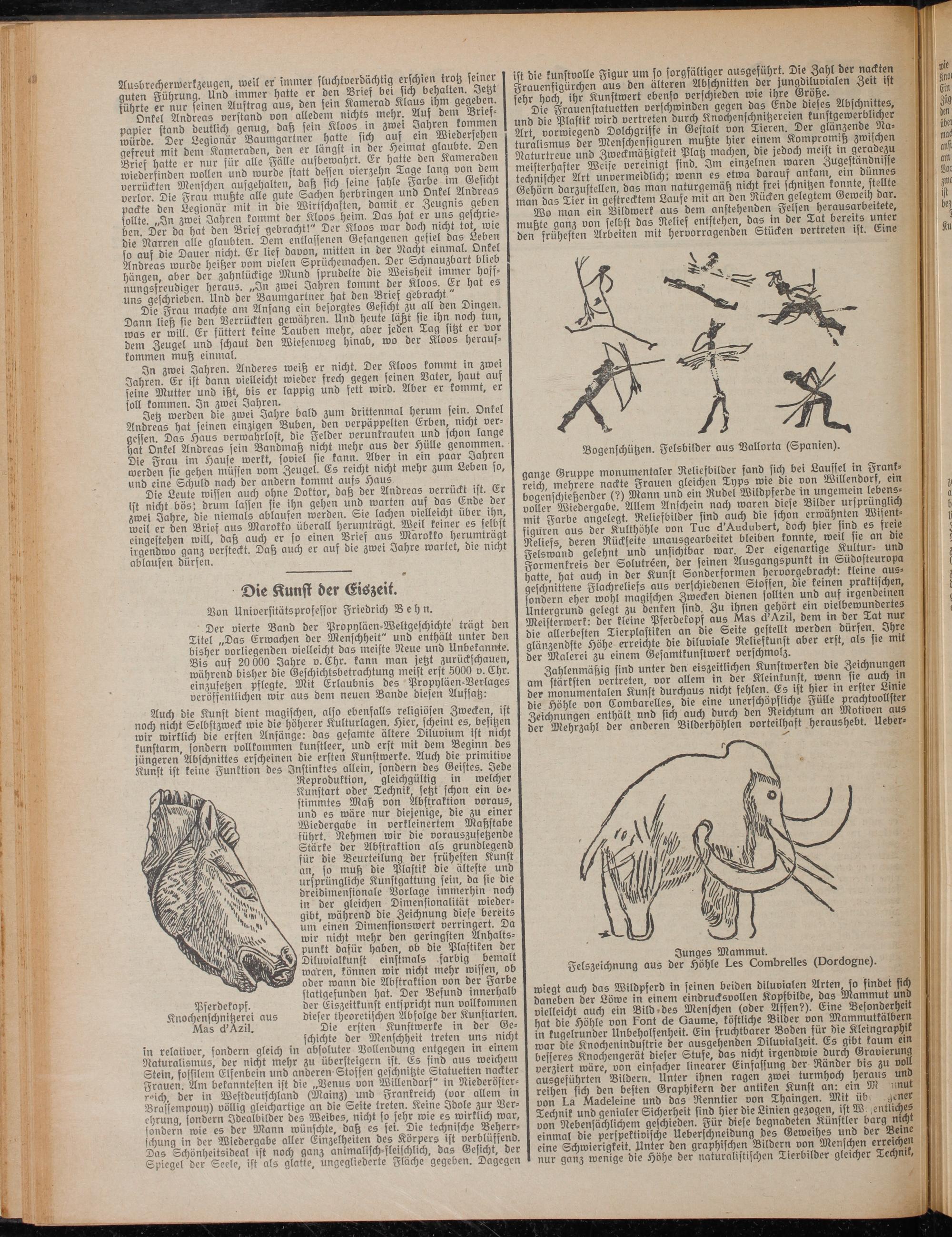 Zahlenmäßig sind unter den eiszeitlichen Kunstwerken die Zeichnungen am stärksten vertreten, vor allem in der Kleinkunst, wenn sie auch m der monumentalen Kunst durchaus nicht fehlen. Es ist hier m»erster Lime die Höhle von Combarelles, die eine unerschöpfliche Fülle prachtvollster Zeichnungen enthält und sich auch durch den Reichtum an Motiven aus der Mehrzahl der anderen Bilderhöhlen vorteilhaft heraushebt. Ueber-
