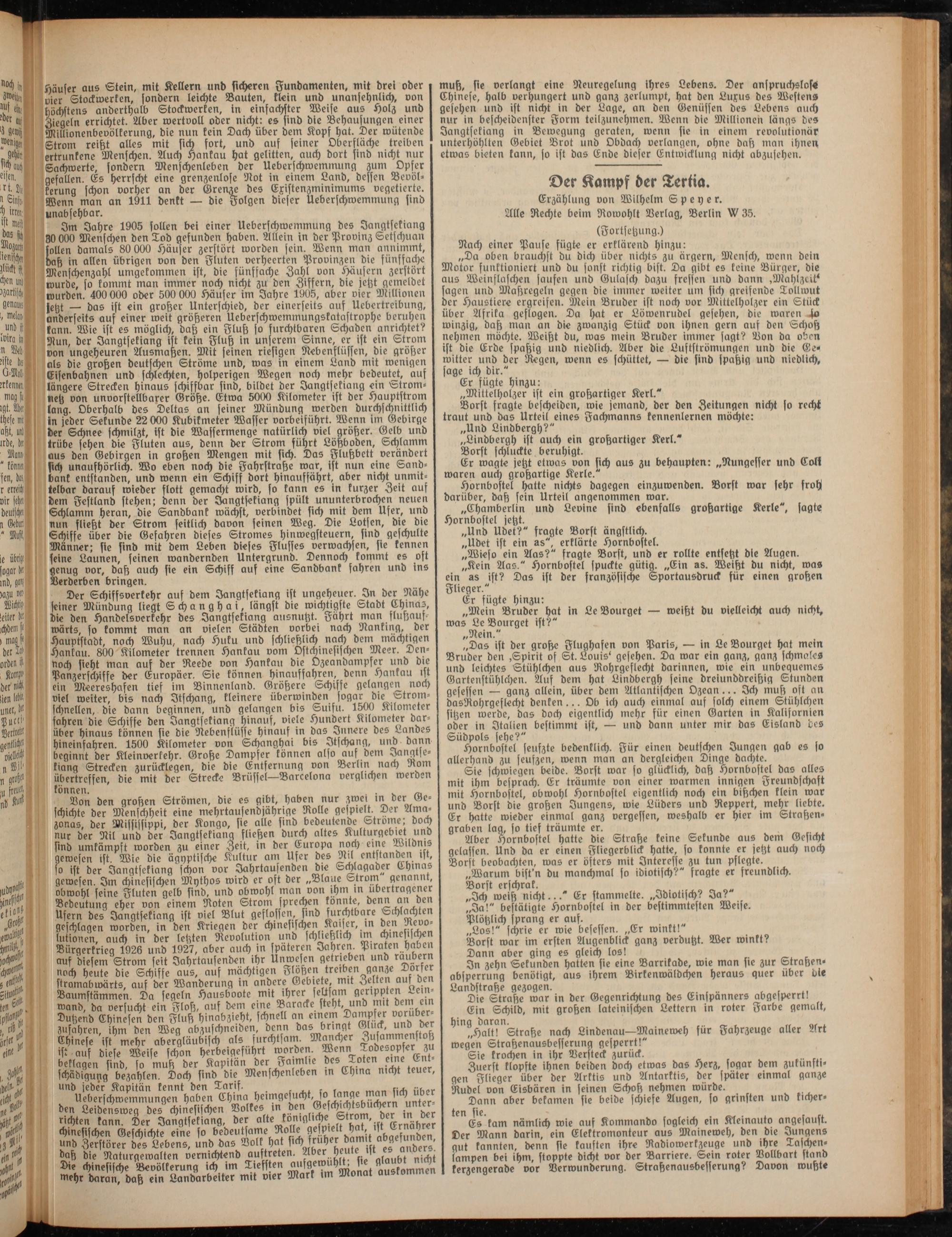 Von den großen Strömen, die es gibt, haben nur zwei in der Geschichte der Menschheit eine mehrtausendjährige Rolle gespielt. Der Amazonas, der Mississippi, der Kongo, sie alle sind bedeutende Strome; doch nur der Nil und der Jangtsekiang fließen durch altes Kulturgebiet und sind umkämpst worden zu einer Zeit, in der Europa noch eine Wildnis gewesen ist. Wie die ägyptische Kultur am Ufer des Nil entstanden ist, so ist der Jangtsekiang schon vor Jahrtausenden die Schlagader Chinas gewesen. Im chinesischen Mythos wird er oft der „Blaue Strom genannt, obwohl seine Fluten gelb find, und obwohl man von ihm in übertragener Bedeutung eher von einem Noten Strom sprechen könnte, denn an Den Ufern des Jangtsekiang ist viel Blut geflossen sind furchtbare Schlachten geschlagen worden, in den Kriegen der chinesischen Kaiser, in den Revolutionen, auch in der letzten Revolution und schließlich im chinestsci;en Bürgerkrieg 1926 und 1927, aber auch in späteren Jahren. Piraten haben auf diesem Strom feit Jahrtausenden ihr Unwesen getrieben und räubern noch heute die Schiffe aus, auf mächtigen Flößen treiben ganze Dörfer stromabwärts, auf der Wanderung in andere Gebiete mit Zetten auf den Baumftämmen. Da segeln Hausboote mit ihrer sellfam gcnpp en Leinwand, da versucht ein Floß, auf dem eine Baracke steht und mit dem em Dutzend Chinesen den Fluß hinabzieht, schnell an einem Samp er Doruber- Zufahren, ihm den Weg abzuschneiden, denn das bringt Mi ck und der Chinese ift mehr abergläubisch als furchtsam. Mancher Zusammenstoß 'st auf diese Weise schon herbeigeführt worden. W^n Todesopfer zu beklagen sind, fo muß der Kapitan der Faimlie des Toten eine Cnt- schädigung bezahlen. Doch sind die Menschenleben in China nicht teuer, und jeder Kapitän kennt den Tarif. u. ...