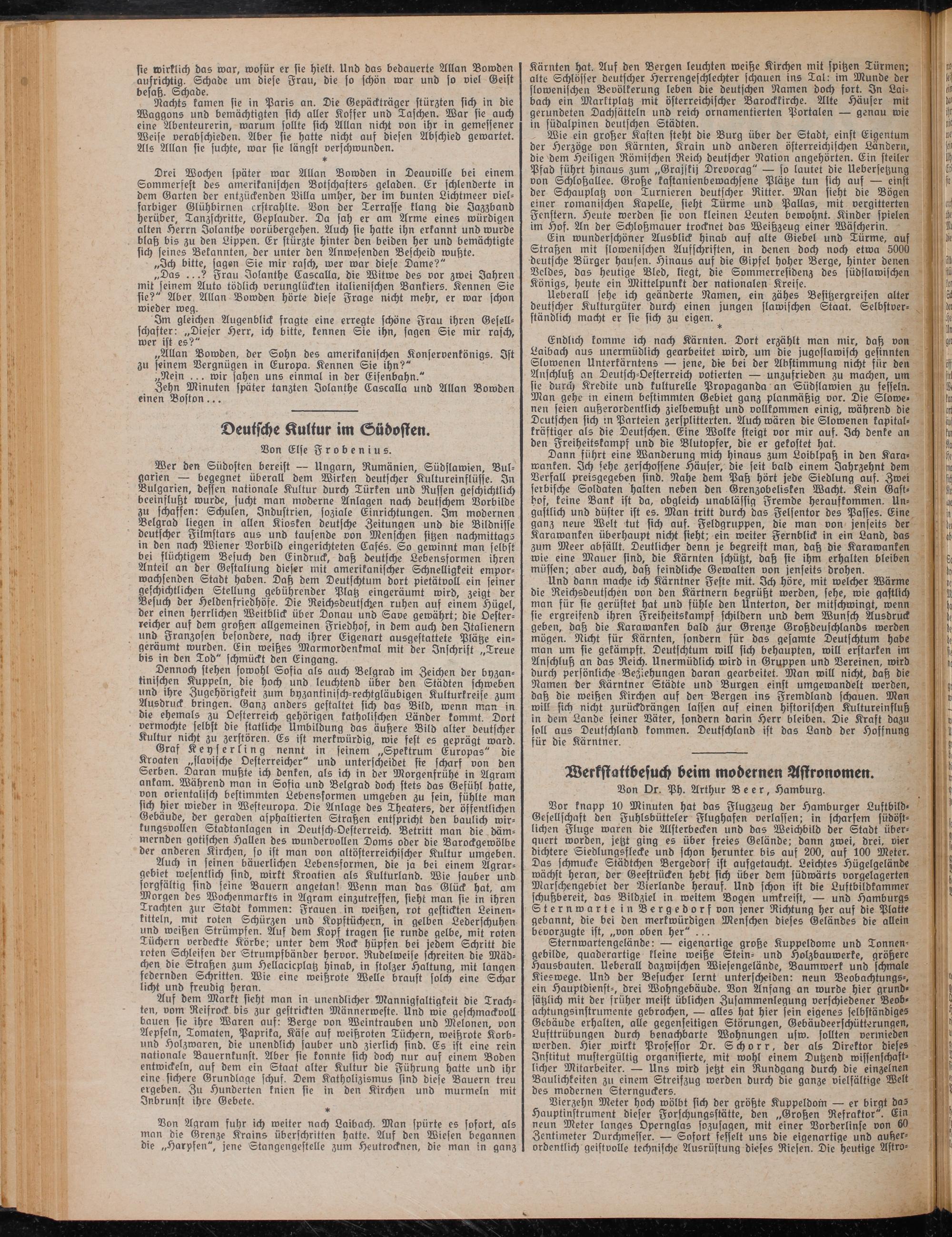 Endlich komme ich nach Kärnten. Dort erzählt man nur, daß von Laibach aus unermüdlich gearbeitet wird, um die jugoslawisch gesinnten toloroenen Unterkärntens — jene, die bei der Abstimmung nicht für den Anschluß an Deutsch-Oesterreich votierten — unzufrieden zu machen, um sie durch Kredite und kulturelle Propaganda an Südslawien zu fesseln. Man gehe in einem bestimmten Gebiet ganz planmäßig vor. Die Slowenen seien außerordentlich zielbewußt und vollkommen einig, während die Deutschen sich in Parteien zersplitterten. Auch wären die Slowenen kapitalkräftiger als die Deutschen. Eine Wolke steigt vor mir auf. Ich denke an den Freiheitskampf und die Blutopfer, die er gekostet hat.
