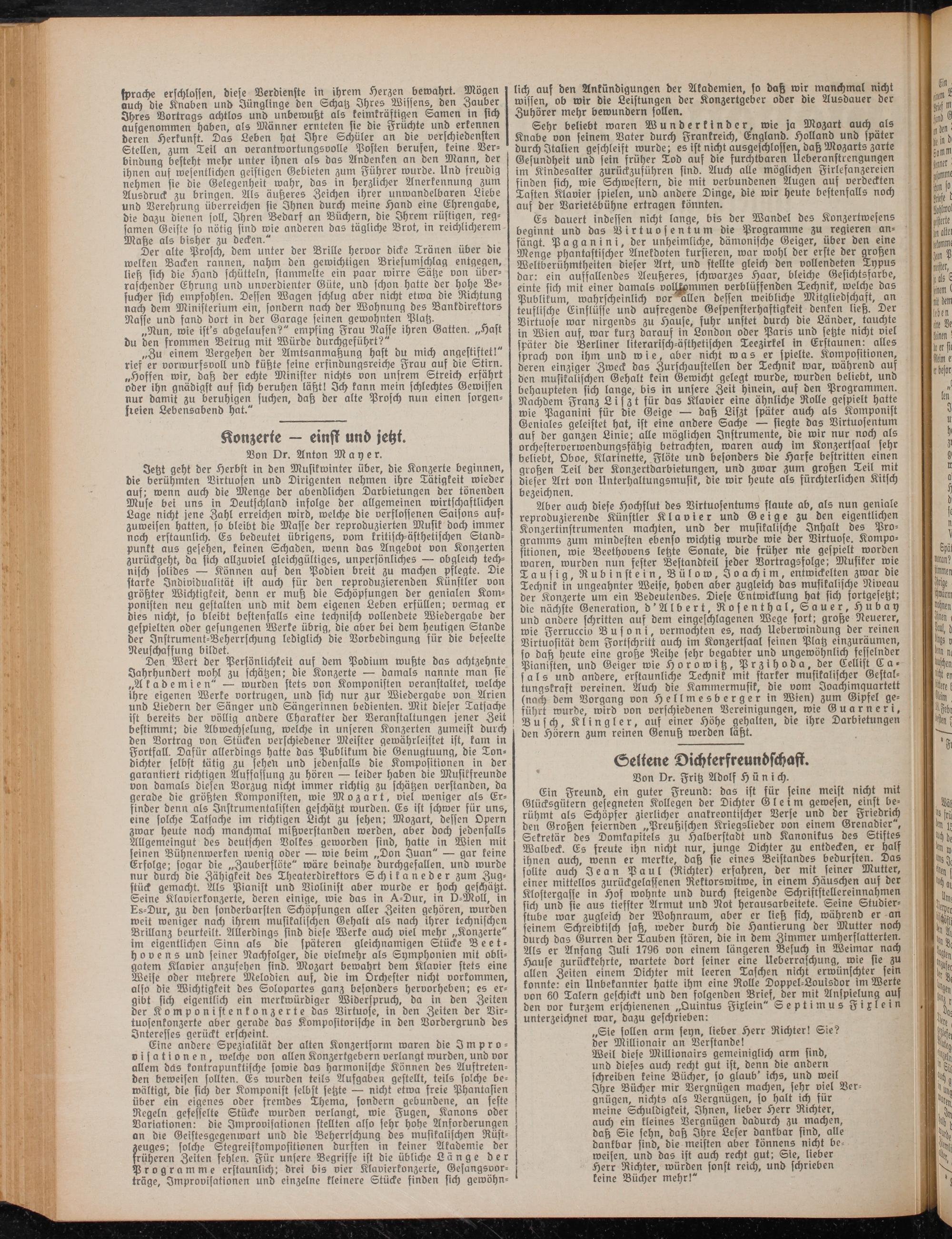 Ein Freund, ein guter Freund: das ist für feine meist nicht mit Glücksgütern gesegneten Kollegen der Dichter Gleim gewesen, einst berühmt als Schöpfer zierlicher anakreontischer Verse unb der Friedrich den Großen feiernden „Preußischen Kriegslieder von einem Grenadier", Sekretär des Domkapitels zu Halberstadt und Kanonikus des Stiftes Walbeck. Es freute ihn nicht nur, junge Dichter zu entdecken, er half ihnen auch, wenn er merkte, daß sie eines Beistandes bedurften. Das füllte auch Jean Paul (Richter) erfahren, der mit feiner Mutter, einer mittellos zurückgelaffenen Rektorswitwe, in einem Häuschen auf ber Kloftergaffe in Hof wohnte und durch steigende Schriftstellereinnahmen sich und sie aus tiefster Armut und Not herausarbeitete. Seine Studierstube war zugleich ber Wohnraum, aber er ließ sich, während er an seinem Schreibtisch saß, weder durch die Hantierung ber Mutter noch burch bas Gurren ber Tauben stören, bie in bem Zimmer umherflatterten. Als er Anfang Juli 1796 von einem längeren Besuch in Weimar nach Hause zurückkehrte, wartete bort seiner eine Ueberraschung, wie sie zu allen Zeiten einem Dichter mit leeren Taschen nicht erwünschter sein konnte: ein Unbekannter hatte ihm eine Rolle Doppel-Louisbor im Werte von 60 Talern geschickt unb den folgenbert Brief, ber mit Anspielung auf ben vor kurzem erschienenen „Quintus Fixlein" Septim u s Fixlein unterzeichnet war, bazu geschrieben: