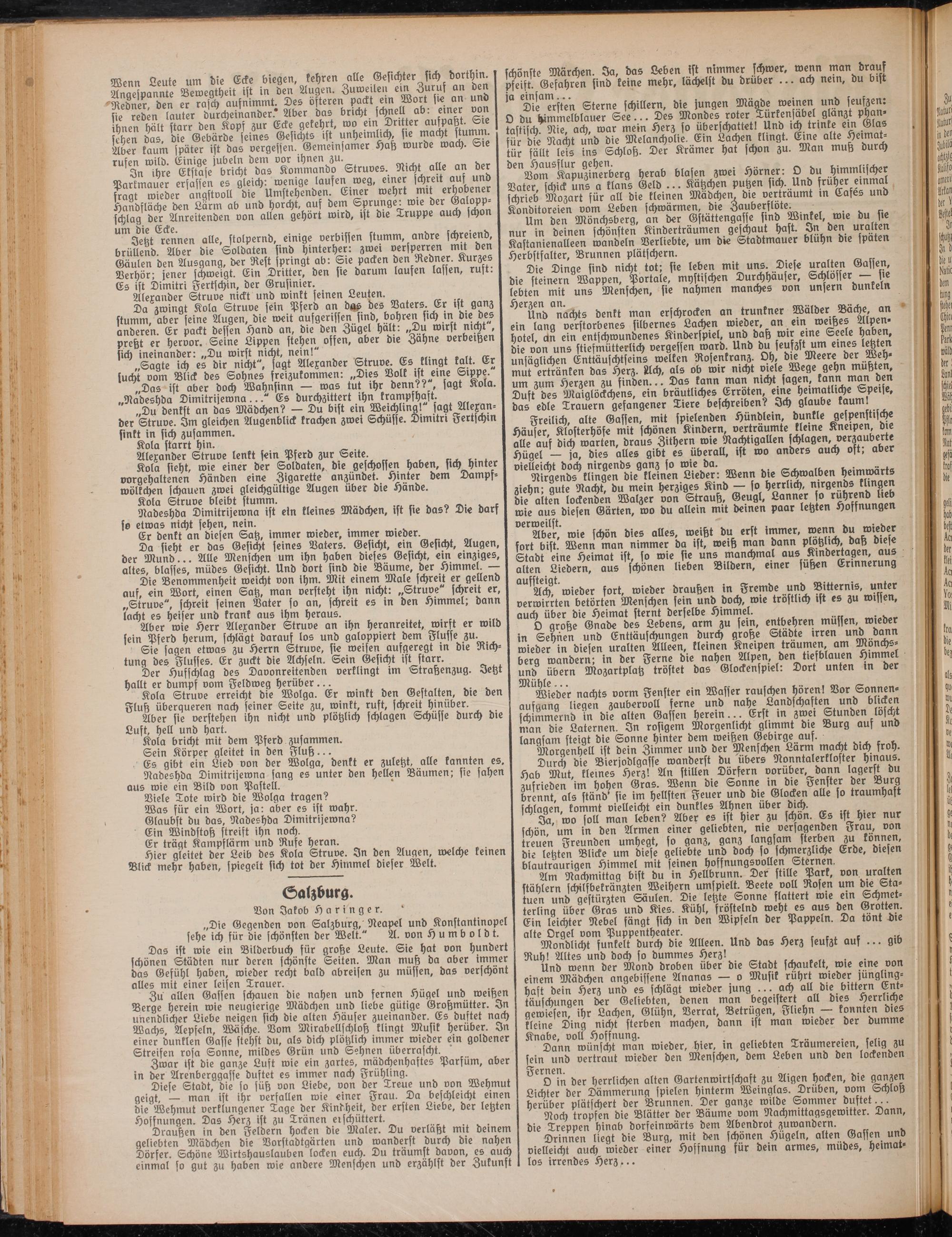 Zu allen Gassen schauen die nahen und fernen Hügel und weihen Berge herein wie neugierige Mädchen und liebe gütige Großmütter. In unendlicher Liebe neigen sich die alten Häuser zueinander. Es duftet nach Wachs Aepseln, Wäsche. Vom Mirabellschloh klingt Musik herüber. In einer dunklen Gasse stehst du, als dich plötzlich immer wieder ein goldener Streisen rosa Sonne, mildes Grün und Sehnen überrascht.