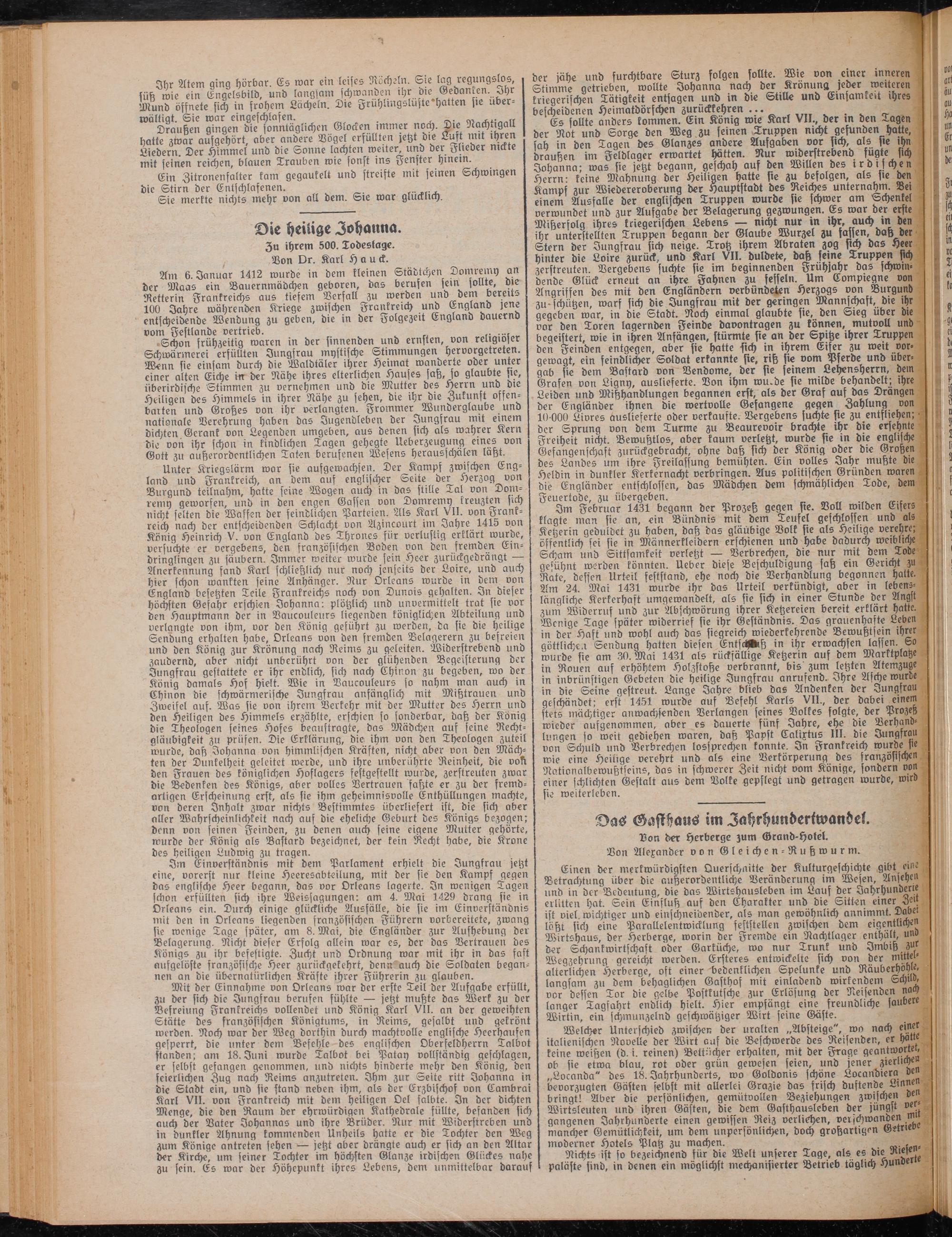 Ain 6. Januar 1412 wurde in dem kleinen Städtchen Domremy an der Maas ein Bauernmädchen geboren, das berufen jein fällte, Die Retterin Frankreichs aus tiefem Verfall zu werden und dem bereits 100 Jahre währenden Kriege zwischen Frankreich und England jene entscheidende Wendung zu geben, die in der Folgezeit England dauernd vom Festlande vertrieb. ....