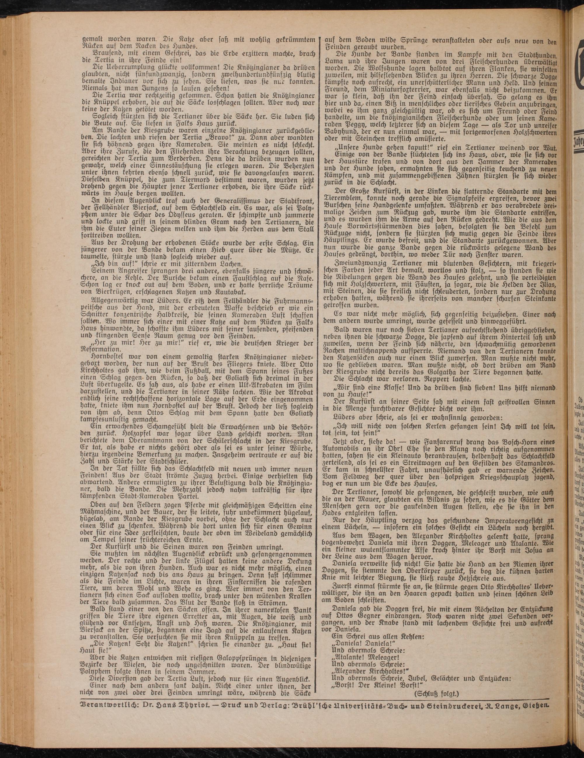 Die Hunde der Bande standen im Kampfe mit den Stadthunden. Lama und ihre Jungen waren von drei Fleischerhunden überwältigt worden. Die Wolfshunde tagen halbtot auf ihren Flanken, sie winselten zuweilen, mit hilfeflehenden Blicken zu ihren Herren. Die schwarze Dogge kämpfte noch aufrecht, ein unerschütterlicher Mann und Held. Und feinem Freund, dem Miniaturfoxterrier, war ebenfalls nicht beizukommen. Er war so klein, daß ihn der Feind einfach übersah. So gelang es ihm hier und ba,- einen Biß in menschliches ober tierisches Gebein anzubringen, wobei es ihm ganz gleichgültig war, ob es sich um Freunb oder Feind handelte, um die knötzingianischen Fleischerhunde oder um seinen Kameraden Peggy, welch letzterer sich an diesem Tage — als Tor und unreifer Babyhund, der er nun einmal war, — mit fortgeworfenen Holzfchwertern oder mit Steinchen trefflich amüsierte.