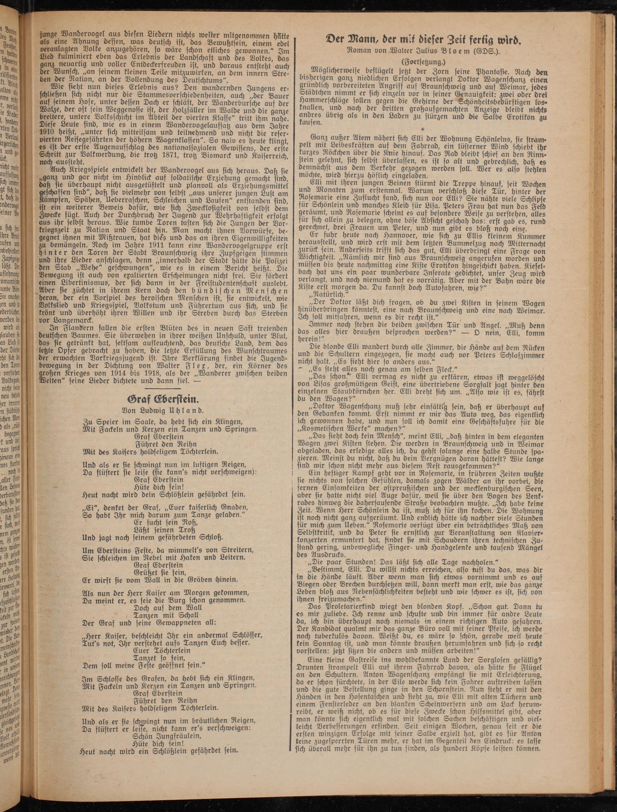 In Flandern fallen die ersten Blüten des in neuen Saft tretenden deutschen Baumes. Sie llberwehen in ihrer weißen Unschuld, unter Blut, das sie getränkt hat, seltsam aufleuchtend, das deutsche Land, dem das letzte Opfer gebracht zu haben, die letzte Erfüllung des Wunschtraumes der erwachten Vorkriegsjugend ist. Ihre Verklärung findet die Jugendbewegung in der Dichtung von Walter F l e x, der, ein Körner des großen Krieges von 1914 bis 1918, als der „Wanderer zwischen beiden Welten" seine Lieder dichtete und dann siel. —