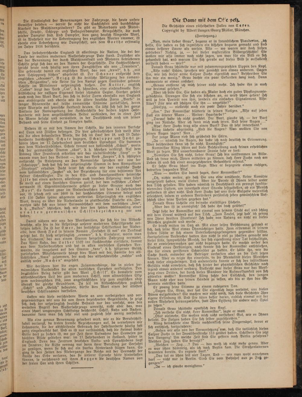 Das seebeherrschende England ist allerdings die Nation, die bei der Taufe der meisten modernen Wassersahrzeuge Pate stand. Deutlicher als bei der Benennung der durch Maschinenkraft und Motoren betriebenen Schisse zeigt sich das an den Namen der Segelschisse. Die Hochseefischerei spricht heute noch häufig von ihren Fangschiffen als von „Trawlern . Sie Gebraucht damit ein englisches 3Bort, das von „trawl , d. y. „mit dem Schleppnetz fischen" abgeleitet ist. Der Schoner entspricht dem englischen „shoöner“, Brigg ist die britische Abkürzung des romam- Ichen „Brigantine", wie kleine für den Kamps gegen Seeräuber gebaute Schiffe im Mittelmeer ursprünglich hießen. Der Kutter, englisch „Cutter“ birgt das Verb „Cut", d. h. schneiden, eine eindrucksvolle Verbildlichung der rassigen Eigenart dieser schmalen Segler. Hierher gehört auch noch das Wort Bark, Las sich in dieser Form ebenfalls von England aus einbürgerte und ebenso wie die ältere deutsche Form „Barke" in langer Ahnenreihe auf frühe romanische Stämme zurückführt, deren legte Wurzeln aus spanische Herkunft deuten. So läßt sich fast der ganze Umkreis der Namengebung der Hochseeschiffe der beiden legten Jahrhunderte mit dem angelsächsischen Vetter verbinden, der in einer die Meer« besuhr und verwaltete, in der Deutschland noch um feinen Bestand und feine Einheit zu kämpfen hatte.