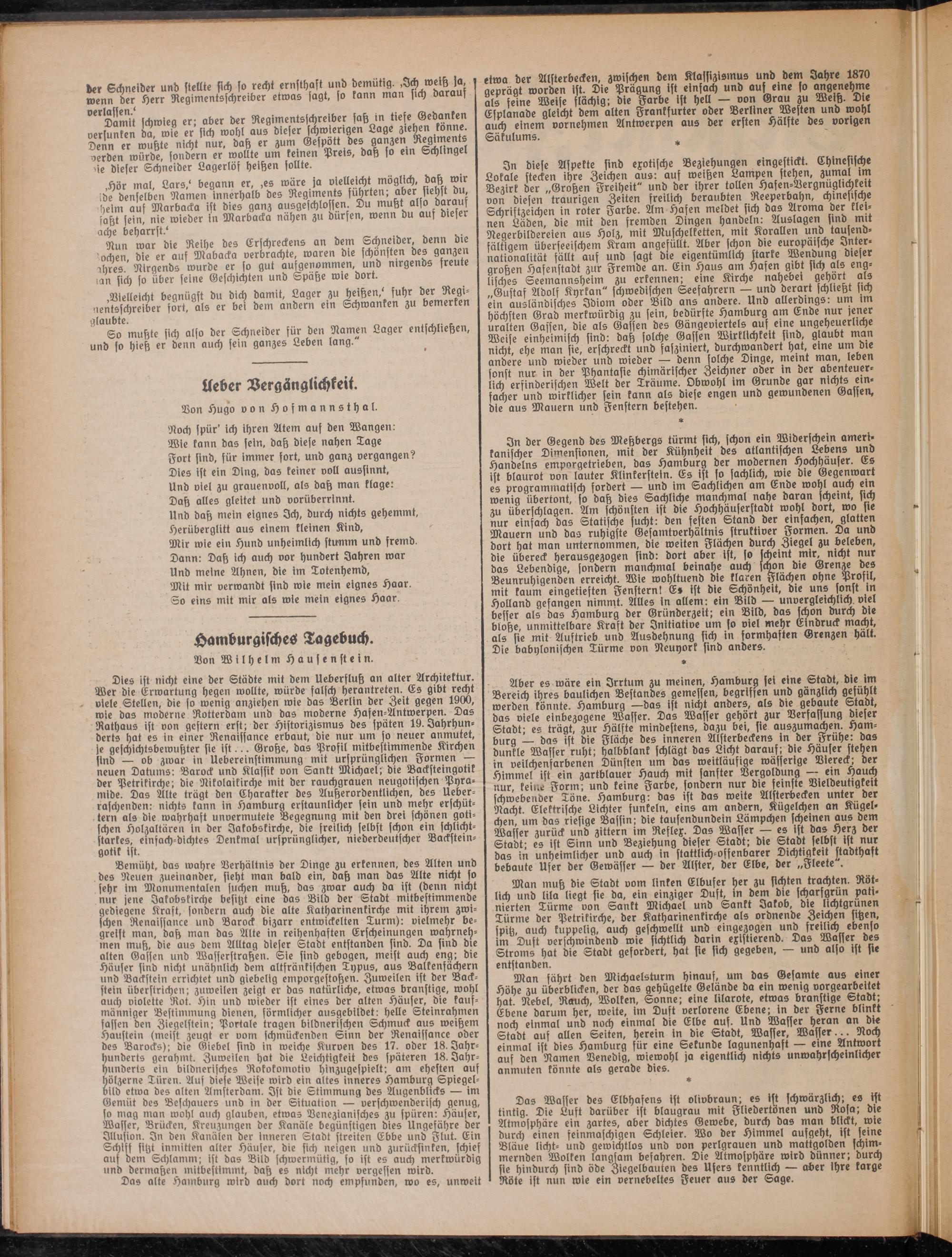 Man fährt den Michaelsturm hinauf, um das Gesamte aus einer Höhe zu überblicken, der das gehügelte Gelände da ein wenig vorgearbeitet hat Nebel, Rauch, Wolken, Sonne; eine lilarote, etwas branftige Stadt; Ebene darum her, weite, im Duft verlorene Ebene; in der Ferne blinkt noch einmal und noch einmal die Elbe auf. Und Wasser heran an bk Stadt auf allen Seiten, herein in die Stadt, Wasser, Wasser... Noch einmal ist dies Hamburg für eine Sekunde lagunenhaft — eineJöntroort auf den Namen Venedig, wiewohl ja eigentlich nichts unwahrfcheinlicher anmuten könnte als gerade dies.