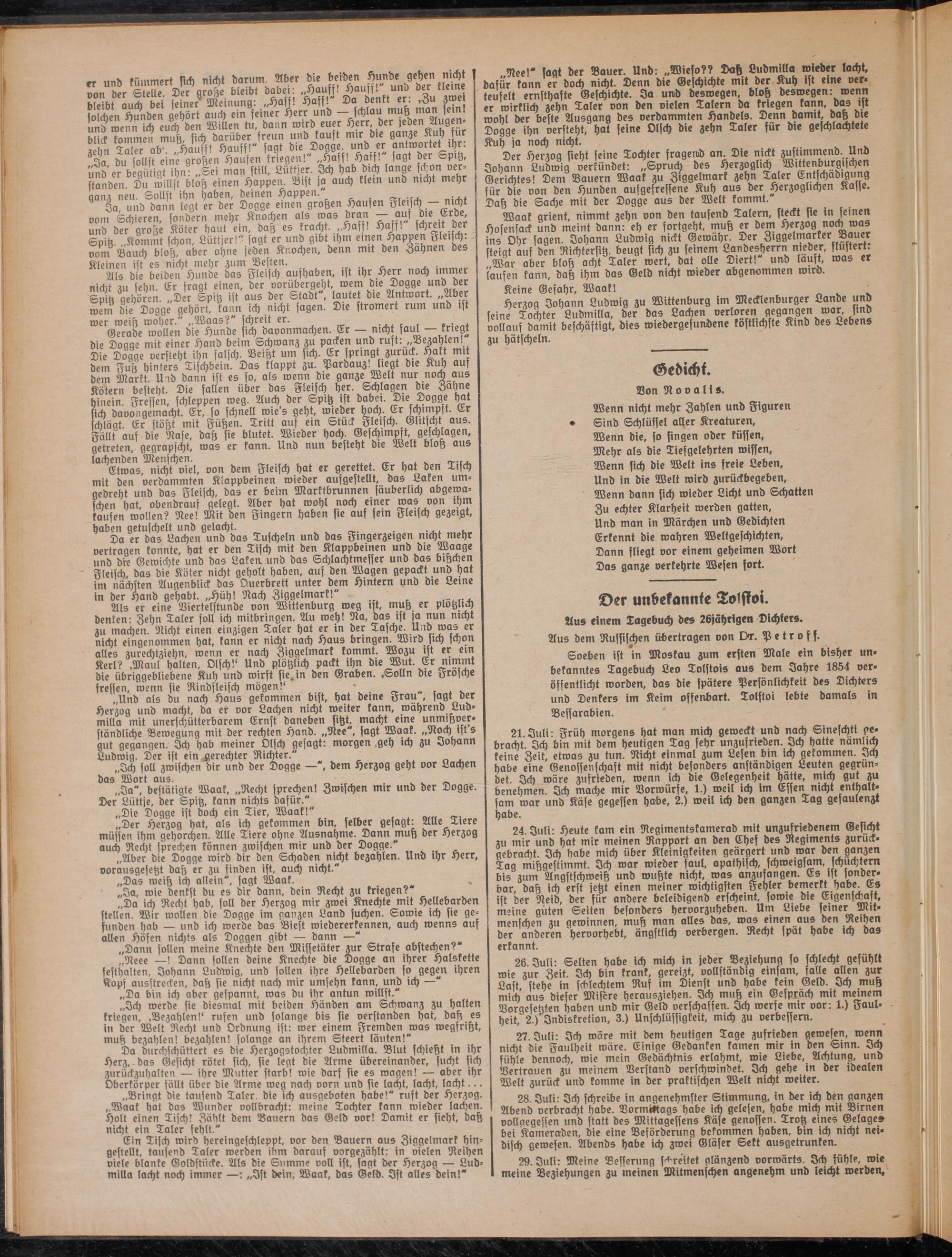 Als bie beiben Hunde bas Fleisch aushaben, ist ihr Herr noch immer nicht zu sehn. Er fragt einen, ber vorübergeht, wem bie Dogge unb ber Spitz gehören. „Der Spitz ist aus ber Stabt“, lautet bie Antwort. „Aber wem bie Dogge gehört, kann ich nicht sagen. Die stromert rum unb ist wer weiß woher." „Waas?" schreit er.