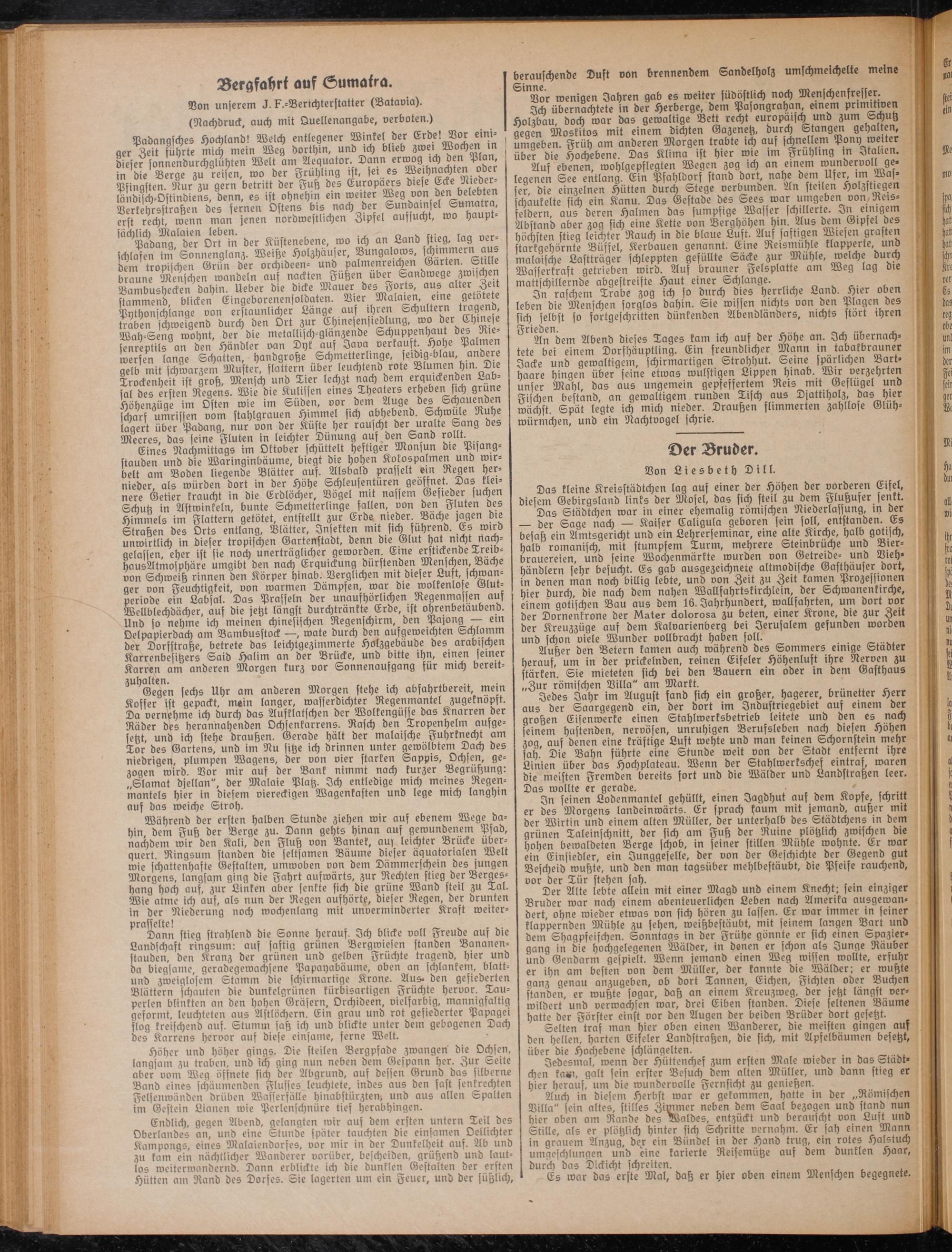 Padangsches Hochland! Welch entlegener Winkel der Erde! Vor eim- ( i ger Zeit führte mich mein Weg dorthin, und ich blieb zweiWochen >n i dieser sonnendurchgluhlen Well am Aequator. Dann °rw°g ich d n Plan in die Berge zu reisen, wo der Frühling ist, sei es Weihnachten oder Pfingsten. Nur zu gern betritt der Fuß des Europäers diese Ecke Nwder- ländisch-Ostindiens, denn, es ist ohnehin ein weiter Weg von den belebten Verkehrsstraßen des fernen Ostens bis nach der Sundainsel Sumatra, erst recht, wenn man jenen nordwestlichen Zipfel aufsucht, wo haupt- ^Pabang^ b'er" DrMn der Küstenebene, wo ich an Land stieg, lag verschlafen im Sonnenglanz. Weiße Holzhäuser, Bungalows, $™rn dem tropischen Grün der orchideen- und palmenreichen Garten. Sülle braune Menschen wandeln aus nackten Fußen über Sandwege zwischen Bambushecken dahin, lieber die dicke Mauer des Forts, aus alter Zeit stammend, blicken Eingeborenensoldaten. Vier Malmen, eine getötete Pythonschlange von erstaunlicher Lange aus ihren Schultern tragend, traben schweigend durch den Ort zur Chinesensiedlung, wo der Chinese Wah-Seng wohnt, der die metallisch-glänzende Schuppenhaut des Riesenreptils an den Händler van Dyk auf Java verkauft. Hohe Palmen werfen lange Schatten, handgroße Schmetterlinge, seidig-blau, andere gelb mit schwarzem Muster, flattern über leuchtend rote Blumen hm. Die Trockenheit ist groß, Mensch und Tier lechzt nach dem erquickenden Labsal des ersten Regens. Wie die Kulissen eines Theaters erheben sich grüne Höhenzüge im Osten wie im Süden, vor dem Auge des Schauenden scharf Umrissen vom stahlgrauen Himmel sich abhebend. Schwule Ruhe lagert über Padang, nur von der Küste her rauscht der uralte Sang des Meeres, das seine Fluten in leichter Dünung aus den Sand rollt