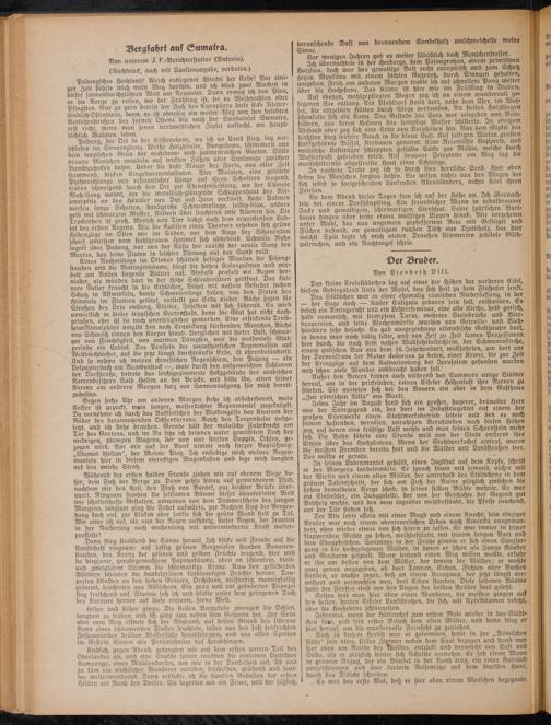 Auf ebenen, wohlgepflegten Wegen zog ich an einem wundervoll gelegenen See entlang. Ein Pfahldorf stand dort, nahe bem Ufer, 'm Was. [er bie einzelnen Hütten burch Stege oerbunben. An steilen Hvlzstiegen chaukelte sich ein Kanu. Das Gestade bes Sees war umgeben von Re,s- elbern, aus bereu Halmen bas sumpfige Wasser (Alliierte. 5n einigem Abstand aber zog sich eine Kette von Berghöhen hin. Aus bem Gipfel des höchsten flieg leichter Rauch in bie blaue Luft. Aus saftigen Wiesen grasten starkgehörnte Büffel, Verbauen genannt. Eine Reismuhle klapperte, und malaische Lastträger schleppten gefüllte Säcke zur Mühle, welche burch Wasserkraft getrieben wirb. Aus brauner Felsplatte am Weg lag bie mattschillernde abgestreiste Haut einer Schlange.