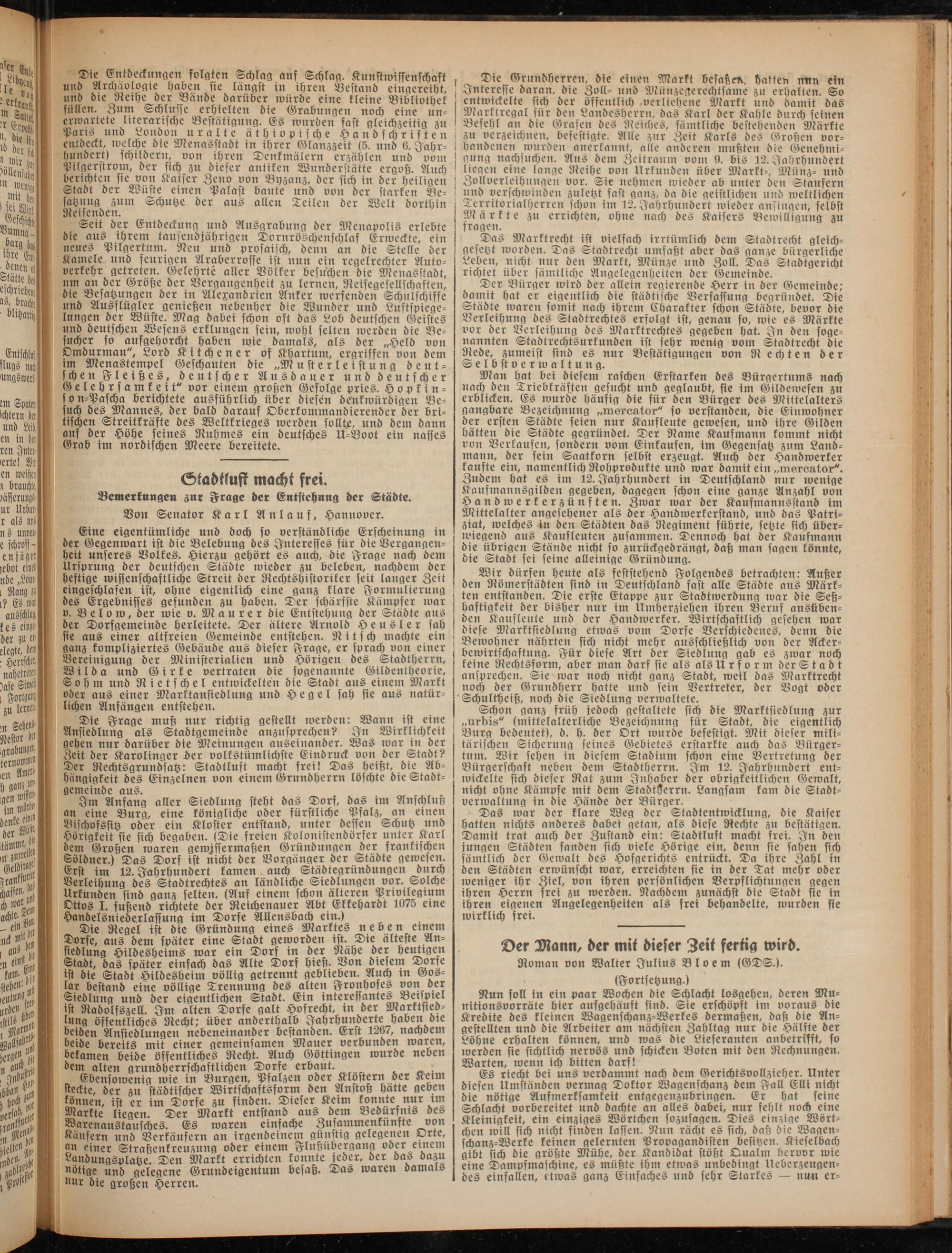 Eine eigentümliche und doch so verständliche Erscheinung in der Gegenwart ist die Belebung des Interesses für die Vergangenheit unseres Volkes. Hierzu gehört es auch, die Frage nach dem Ursprung der deutschen Städte wieder zu beleben, nachdem der heftige wissenschaftliche Streit der Rechtshistoriker seit langer Zeit eingeschlafen ist, ohne eigentlich eine ganz klare Formulierung des Ergebnisses gefunden zu haben. Der schärfste Kämpfer war v. Below, der wie v. Maurer die Entstehung der Städte aus der Dorfgemeinde herlettete. Der ältere Arnold Heusler sah sie aus einer altfreien Gemeinde entstehen. Nitsch machte ein ganz kompliziertes Gebäude aus dieser Frage, er sprach^von einer Bereinigung der Ministerialien und Hörigen des Stadtherrn, Wilda und Girke vertraten die sogenannte Gildentheorie, S o h m und R i e t s ch e l entwickelten die Stadt aus einem Markt oder aus einer Marktansiedlung und Hegel sah sie aus natürlichen Anfängen entstehen.
