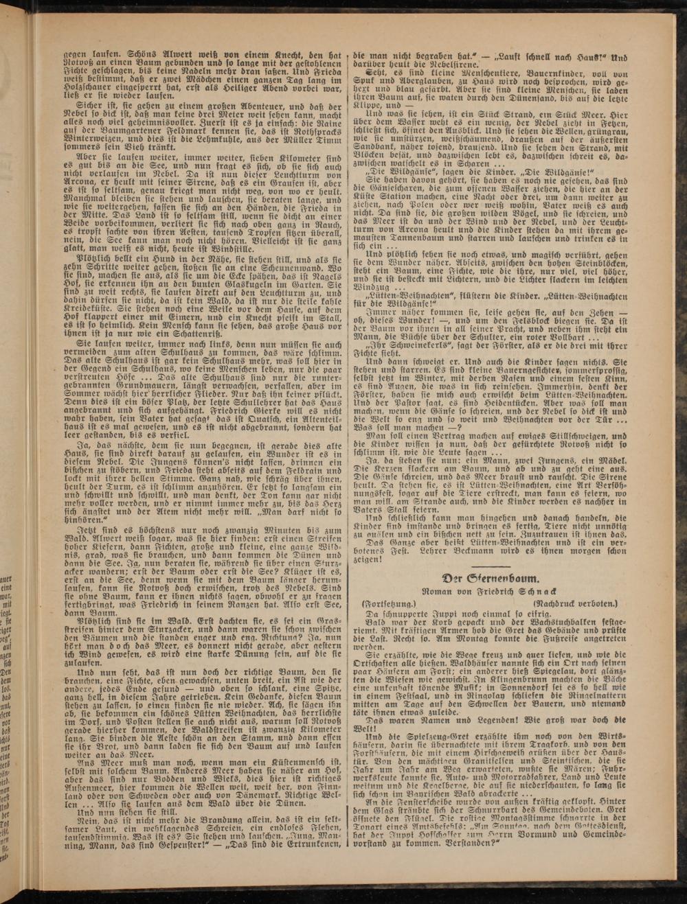 Und nun seht, das ist nun doch der richtige Baum, den sie brauchen, eine Fichte, eben gewachsen, unten breit, ein Ast wie der andere, jedes Ende gesund — und oben so schlank, eine Spitze, ganz hell, in diesem Jahre getrieben. Kein Gedanke, diesen Baum stehen zu laffen, so einen finden sie nie wieder. Ach, sie sägen ibn ab, sie bekommen ein schönes Lütten Weihnachten, das herrlichste im Dors, und Posten stellen sie auch nicht aus, warum soll Rotvoß gerade hierher kommen, der Waldstreifen ist zwanzig Kilometer lang. Sie binden die Aeste schön an den Stamm, und dann effen sie ihr Brot, und dann laden sie sich den Baum auf und laufen weiter an das Meer.