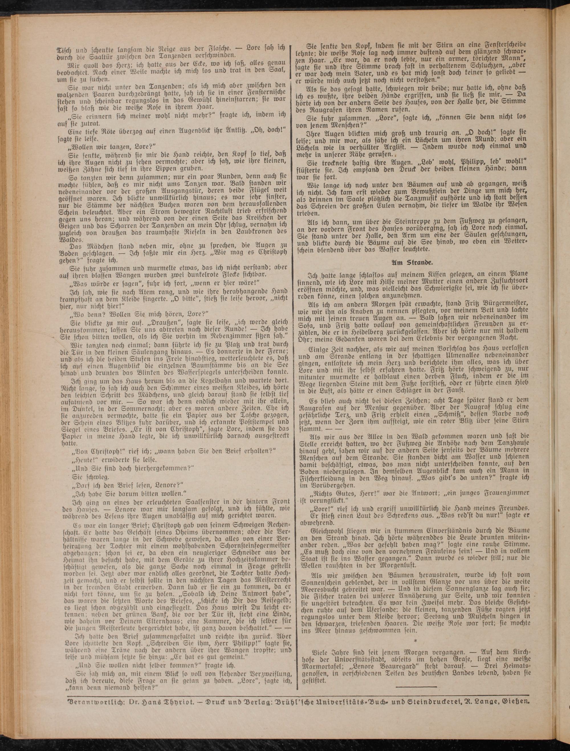 Viele Jahr« find seit jenem Morgen vergangen. — Aus dem Kirchhofe der Universitätsstadt, abseits im hohen Grase, liegt eine weiß« Marmortafel; „Lenore Beauregard" steht darauf. — Drei Heimats- genossen, in verschiedenen Teilen des deutschen Landes lebend, haben sie gestiftet.