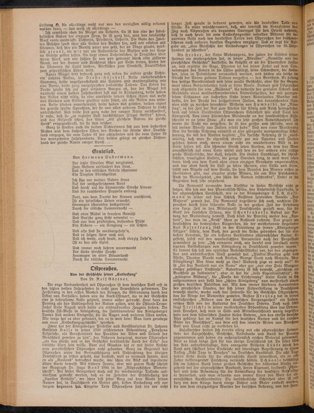 Die enge Verbundenheit mit Ostpreußen ist dem deutschen Volk erst in den letzten beiden Jahrzehnten so recht zum Bewußtsein gekommen. Die Zerstörung in den ersten Wochen des Krieges, die Abtrennung durch das Diktat von Versailles haben uns die Nord-Ostmark, die in der Geschichte eine so bedeutsame Rolle gespielt, immer näher gebracht. Heut kann die Provinz als das Lieblingskind der Nation gelten, und die Ostland-Treue- Fahrt Ende August wird dafür ein eindrucksvolles Zeugnis liefern. Die deutsche Ost-Messe in Königsberg, die Jubiläumsfeier des Königsberger Domes sind weitere Ereignisse, die die Augen nach unserem Osten lenken. Wie lange hat es aber gedauert, bis es so weit kam! Man kann geradezu von einer „Entdeckungsgeschichte" sprechen.