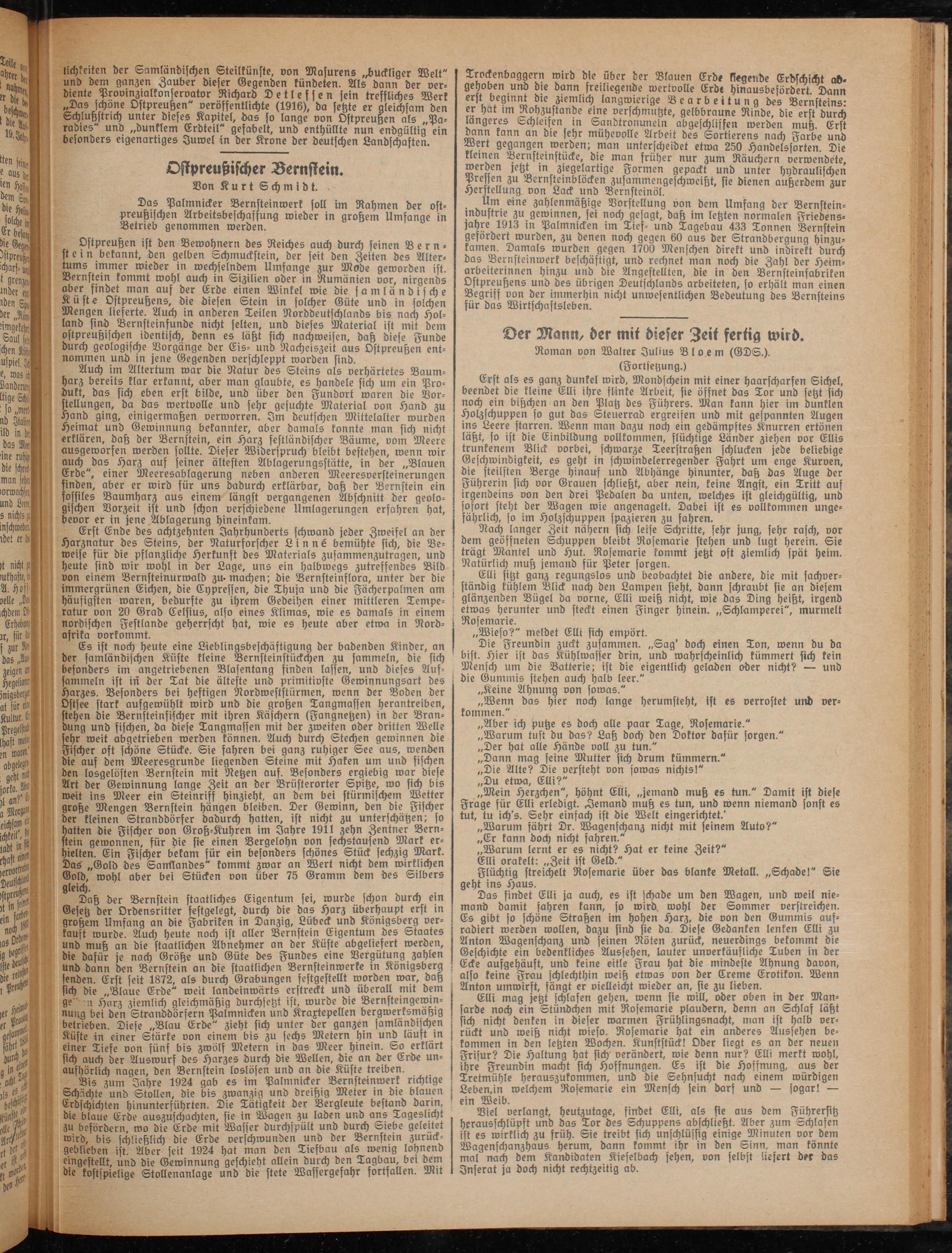 Ostpreußen ist den Bewohnern des Reiches auch durch seinen V ernst e i n bekannt, den gelben Schmuckstein, der seit den Zeiten des Altertums immer wieder in wechselndem Umfange zur Mode geworden ist. Bernstein kommt wohl auch in Sizilien oder in Rumänien vor, nirgends aber findet man auf der Erde einen Winkel wie die samländische Küste Ostpreußens, die diesen Stein in solcher Güte und in solchen Mengen lieferte. Auch in anderen Teilen Norddeutschlands bis nach Holland sind Bernsteinfunde nicht selten, und dieses Material ist mit dem ostpreußischen identisch, denn es läßt sich nachweisen, daß diese Funde durch geologische Vorgänge der Eis- und Nacheiszeit aus Ostpreußen entnommen und in jene Gegenden verschleppt worden sind.