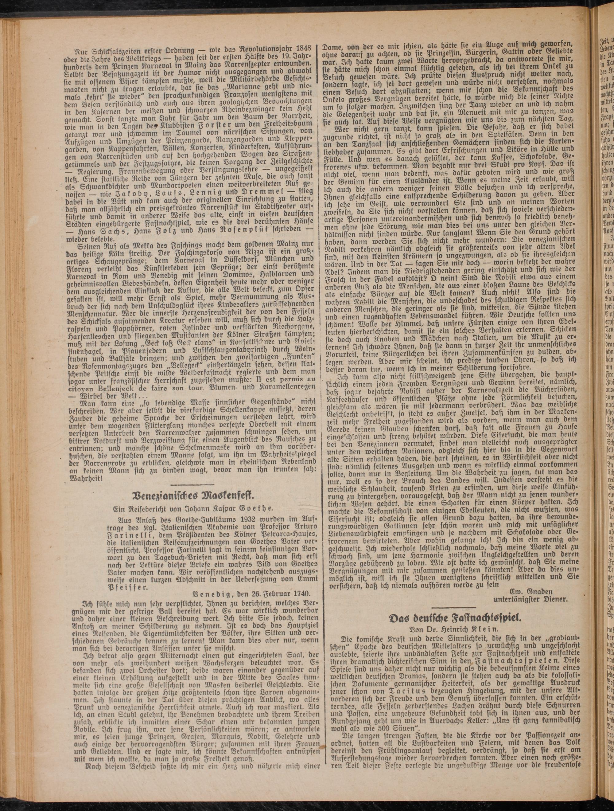 Man kann eine „so lebendige Masse sinnlicher Gegenstände nicht beschreiben. Wer aber selbst die vierfarbige Schellenkappe aufsetzt, deren Zauber die geheime Sprache der Erscheinungen verstehen lehrt, wird unter dem wogenden Flitterglanz manches versetzte Oberbett mit einem versetzten Unterbett den Narrenwalzer zusammen schwingen sehen, um bittrer Notdurft und Verzweiflung für einen Augenblick des Rausches zu entrinnen; und manche schöne Schelmenmaske wird an ihm vorüber- huschen, die verstohlen einem Manne folgt, um ihn im Wahrheitsspiegel der Narrennrobe zu erblicken, gleichwie man in rheinischem Rebenland an keinen Mann sich zu binden wagt, bevor man ihn trunken sah: Wahrheit!