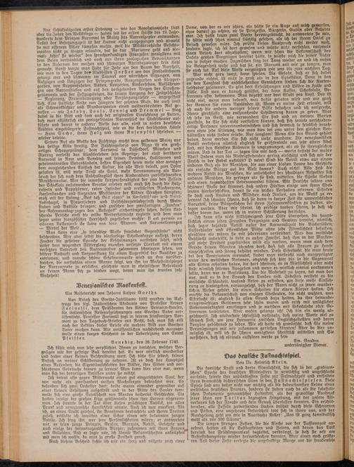 Auszügen und Umzügen der Prinzengarde, Ranzengarden und Kleppergarden, von Kappensahrten, Bällen, Konzerten, Kinderfesten, Aufführungen von Narrenstücken und auf den hochgehenden Wogen des Straßengetümmels und der Festzugssatyr-, die keinen Vorgang der Ze>tg°schcchte — Regierung, Frauenbewegung oder Veriungung-lehre — ungegeifjelt ließ. Eine stattliche Reihe von Jüngern der zehnten Muse, die auch sonst als Schwankdichter und Mundartpoeten einen weitverbreiteten Ruf genossen - wie I a k o b y, L a u f s, L e n n i g und D r e m m e l — fheg dabei in die Bütt und kam auch der originellen Einrichtung zu statten, daß man alljährlich ein preisgekröntes Narrenstück im Stadttheater aufführte und damit in anderer Weise das alte, einst in vielen deutschen Städten eingebürgerte Fastnachtfpiel, wie es die drei berühmten Hanse — Hans S a ch s, Hans Folz und Hans R o s e n p l u t schrieben —