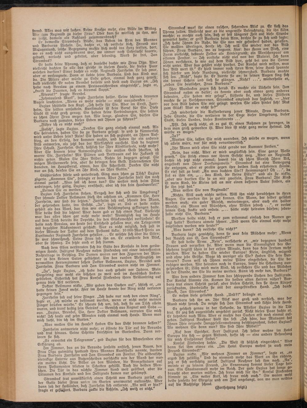 Nach dem Essen verstreuten sich die Gäste des Konsuls in dem geräumigen Hause. Justizrat Reußner nahm Finkendey nut einer mtereffanten Recktsfraae in Beschlag. Die Damen waren vor den Zigarren der Manner in den «einen Salon geflüchtet. Um den runden Messingtisch un verwaisten Herrenzimmer sahen Dvftor Bellmann, Luzius, Brendel und Zurrhelrn. Frau Barbara und Jan Strombeck waren nicht tm Zimmer.