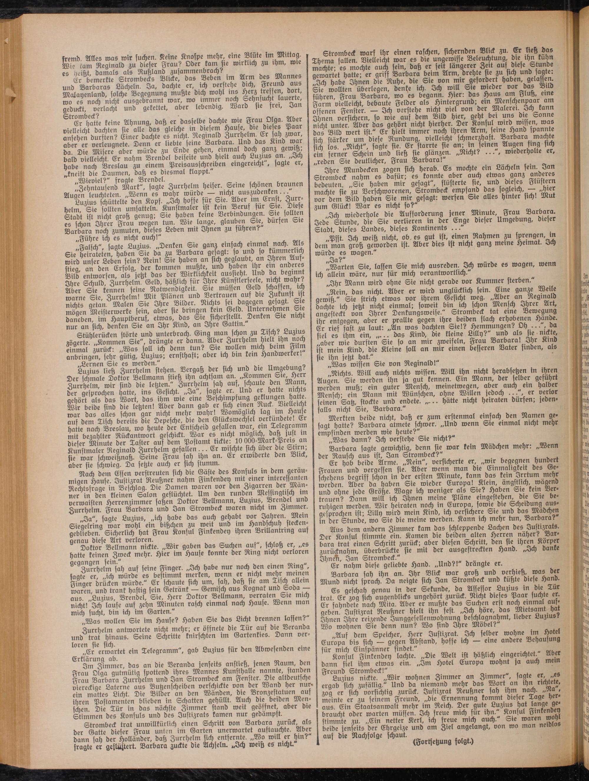 Strombeck warf ihr einen raschen, sichernden Blick zu. Er Heß das Thoma fallen. Vielleicht war es die ungewisse Beleuchtung die ihn kühn machte; es mochte auch fein, daß er feit längerer Seit aus diese Stunde gewartet hatte; er griff Barbara beim Arm, dreh e sie zu sich und sagte. Ich habe Ihnen die Ruhe, die Sie von mir gefordert haben, gelassen. Sie wollten überlegen, deiche ich. Ich will Sie wieder vor das Bild führen, Frau Barbara, wo es begann. Hier: das Haus am Fluß, eine Farm vielleicht, bebaute Felder als Hintergrund; ein Menschenpaar am offenen Fenster. — Ich verstehe nicht viel von der Malerei. Ich kann Ihnen versichern, so wie auf dem Bild hier, geht bei uns die Sonne nicht unter. Aber das gehört nicht hierher. Der Konsul ch'rd wissen, was das Bild wert ist." Er hielt immer noch ihren Arm, seine Hand spannte sich stärker um diese Rundung, vielleicht schmerzhaft. Barbara machte sich los. „Nicht", sagte sie. Er starrte sie an; in feinen Augen fing sich ein ferner Schein und ließ sie glänzen. „Nicht? .... wiederholte er, „reden Sie deutlicher, Frau Barbara!"