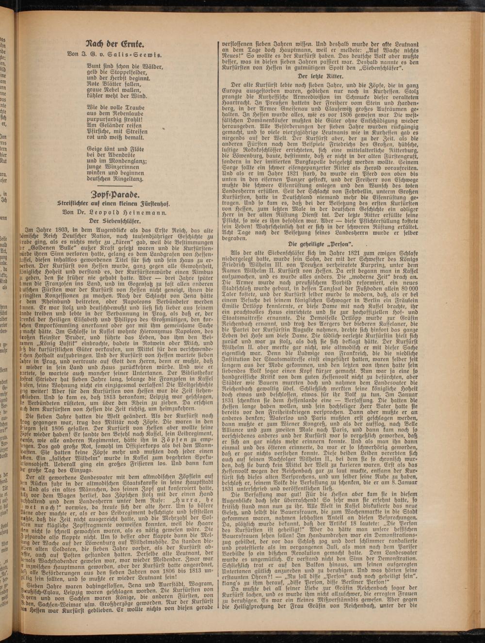 Die Verfassung war gut! Für die Hessen aber kam sie in diesem Augenblicke doch sehr überraschend! So sehr man sie ersehnt hatte, so kritisch stand man nun zu ihr. Alle Welt in Kassel diskutierte das neue Gesetz, und selbst die Bauersfrauen, die zum Wochenmarkte in die Stadt gekommen waren, nahmen lebhaften Anteil an diesen Besprechungen. Da, plötzlich wurde bekannt, daß der Artikel 18 lautete: „Die Person des Kurfürsten ist geheiligt!" Aber da hätte man unsere hessischen Bauersfrauen sehen sollen! Im Handumdrehen war ein Demonstrations- zug gebildet, der vor das Schloß zog und dort schlimmer randalierte und protestierte als im vergangenen Juli, als man nach dem Pariser Vorbilde so ein bißchen Revolution gemacht hatte. Dem Landesvater wurde es ungemütlich. Er verstand nicht den Sinn der Demonstration. Schließlich trat er auf den Balkon hinaus, um seinen aufgeregten Untertanen gütlich anzureden und zu beruhigen. Und was hörten feine erstaunten Ohren?! — „Nu soll disse „Person" auch noch geheiligt sein", flang’s zu ihm herauf, „disse Person, disse Berliner Person!"