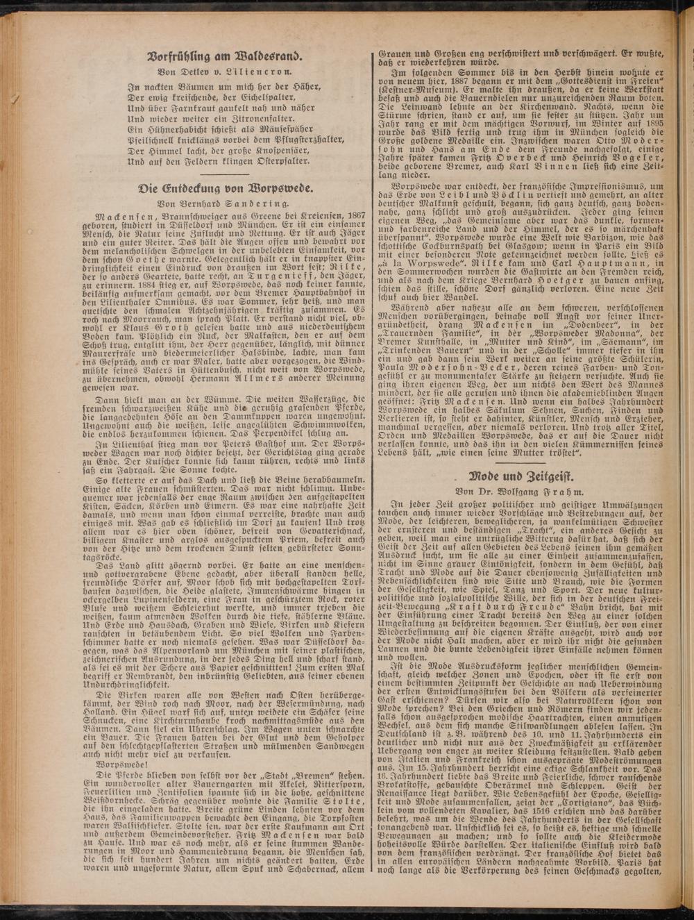 Während aber nahezu alle an dem schweren, verschlossenen Menschen vorübergingen, beinahe voll Angst vor seiner Uner- gründetheit, drang Mackensen im „Dodenbeer", in der „Trauernden Familie", in der „Worpsweder Madonna", der Bremer Kunsthalle, in „Mutter und Kind", im „Säemann", im „Trinkenden Bauern" und in der „Scholle" immer tiefer in ihn ein und gab dann fein Werk weiter an seine größte Schülerin, Paula Modersohn-Vecker, deren reines Farben- und Ton- gefühl er zu monumentaler Stärke zu steigern versuchte. Auch sie ging ihren eigenen Weg, der um nichts den Wert des Mannes mindert, der sie alle gerufen und ihnen die akademieblinden Augen geöffnet: Fritz Mackensen. Und wenn ein halbes Jahrhundert Worpswede ein halbes Säkulum Sehnen, Suchen, Finden und Verlieren ist, so steht er dahinter, Künstler, Mensch und Erzieher, manchmal vergessen, aber niemals verloren. Und trotz aller Titel, Orden und Medaillen Worpswede, das er auf die Dauer nicht verlassen konnte, und das ihn in den vielen Kümmernissen seines Lebens hält, „wie einen seine Mutter tröstet".