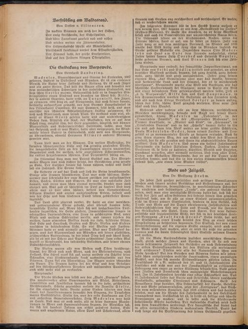 Die Pferde blieben von selbst vor der „Stadt „Bremen" stehen. Ein wundervoller alter Bauerngarten mit Akelei, Rittersporn, Feuerlilien und Zentifolien spannte sich in die hohe, geschnittene Weißdornhecke. Schräg gegenüber wohnte die Familie Stolte, die ihn eingeladen hatte. Breite grüne Linden lehnten vor dem Haus, das Familienwappen bewachte den Eingang, die Torpfosten rvareii Walfischkiefer. Stolte sen. war der erste Kaufmann am Ort und außerdem Gemeindevorsteher. Fritz Mackensen war bald zu Hause. Und war es noch mehr, als er seine stummen Wanderungen in Moor und Hammeniedrung begann, die Menschen sah, die sich seit hundert Jahren um nichts geändert hatten, Erde waren und ungeformte Natur, allem Spuk und Schabernack, allem