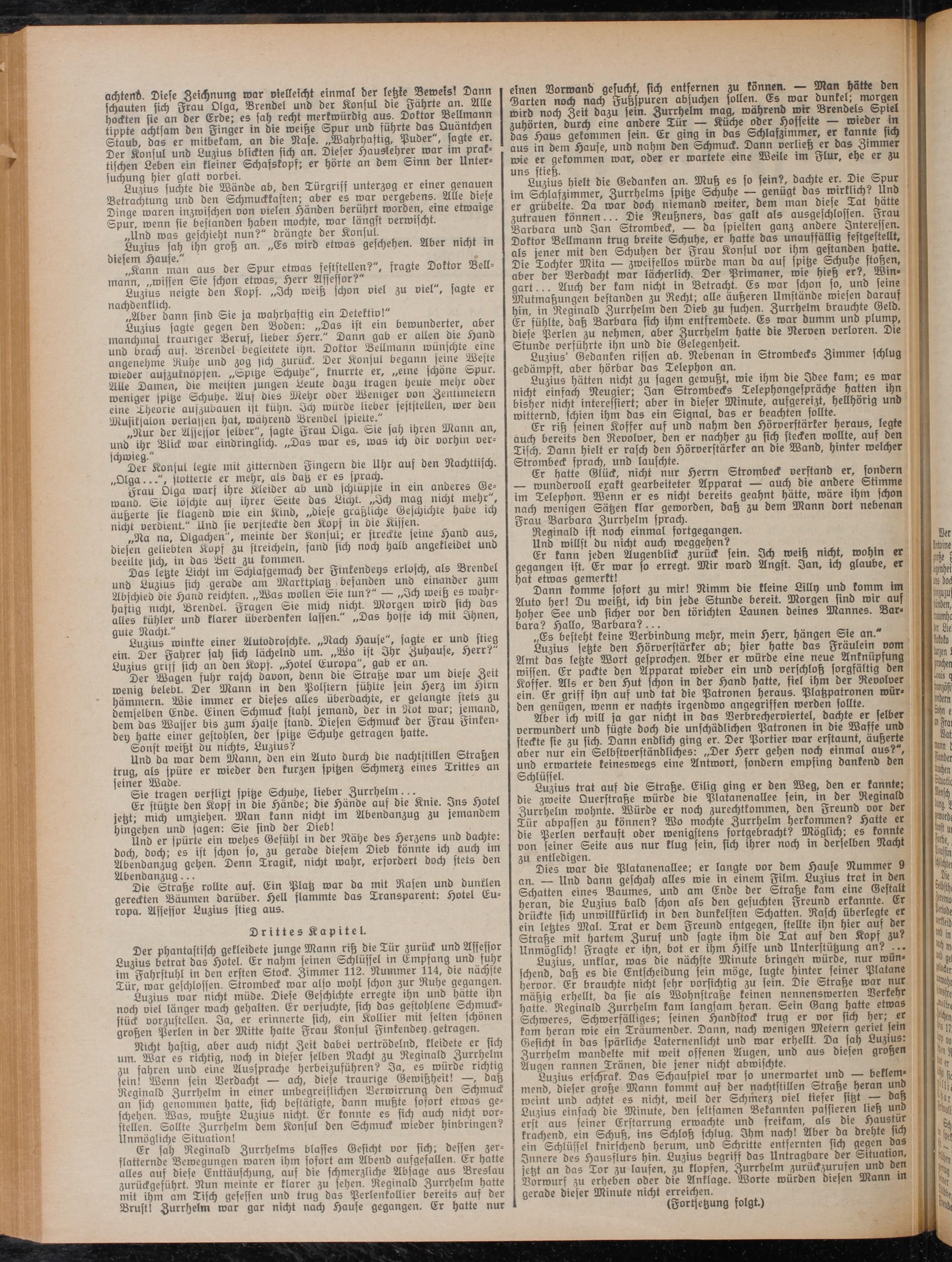 Luzius trat auf die Straße. Eilig ging er den Weg, den er kannte; die zweite Querstraße würde die Platanenallee fern, in der Regmald Zurrhelm wohnte. Würde er noch zurechtkommen, den Freund vor der Tür abpaffen zu können? Wo mochte Zurrhelm Herkommen? Hatte er die Perlen verkauft ober wenigstens fortgebracht? Möglich; es konnte von feiner Seite aus nur klug fein, sich ihrer noch in derselben Nacht zu entledigen. m n